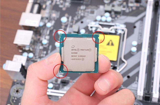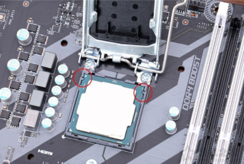 - 以intel处理器为例,AMD也可以参考安装,我们再取出CPU,并完成CPU与主板的安装,我们需要注意CPU上的两个凹槽,以便正确的安装到主板的CPU插槽中,如下图所示。