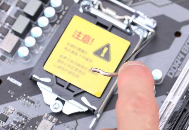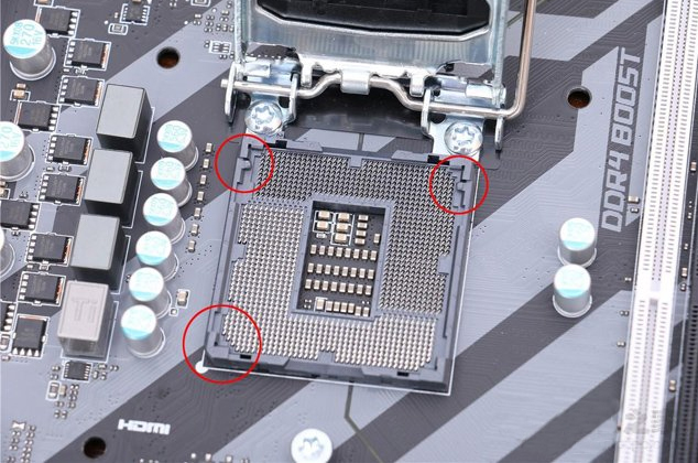 - 我们将主板CPU插槽的拉杆打开插槽上盖,如下图所示,我们将CPU的两个凹槽对应CPU插槽中凸点,即可正确安装。