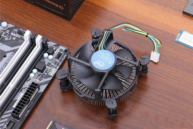 这时CPU与主板已经正确安装了。风扇以Intel原装风扇为例,散热器底部自带硅脂,这时我们将散热器安装,关于第三方的散热器安装,请参考散热器中说明书。