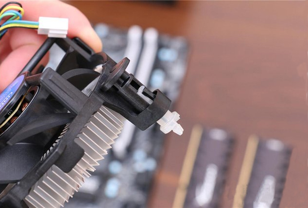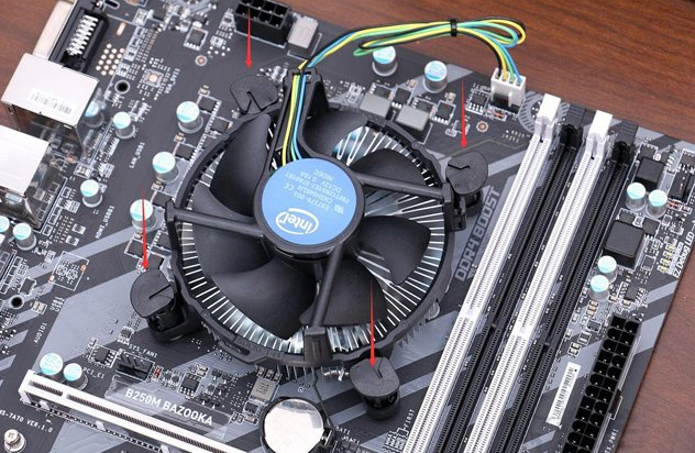 - 我们将散热器的塑料针脚卡扣与主板(CPU插槽四周)的四个圆孔对齐之后,分别以角线的方式用力往下压即可将CPU风扇固定到主板上,再将散热器的供电线连接至主板CPU FAN的插槽上。