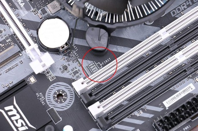 下面我们进行内存的安装,安装内存十分简单,一根内存任意安装到主板内存插槽中,如果需要安装两根内存,四根内存插槽,我们分别安装到黑色内存插槽或者白色内存插槽中,即可组建双通道内存。