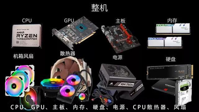CPU(处理器)、GPU(显卡)、主板、内存、硬盘、电源、CPU散热器、风扇、机箱