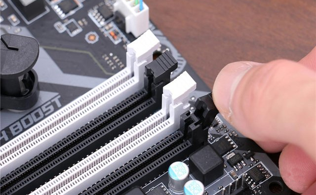 一般来说,内存插槽两边会有固定卡扣设计,安装内存之前,我们需要将卡扣按下(内存插槽两边有固定卡扣设计,请将两边卡扣都按下),如下图所示。