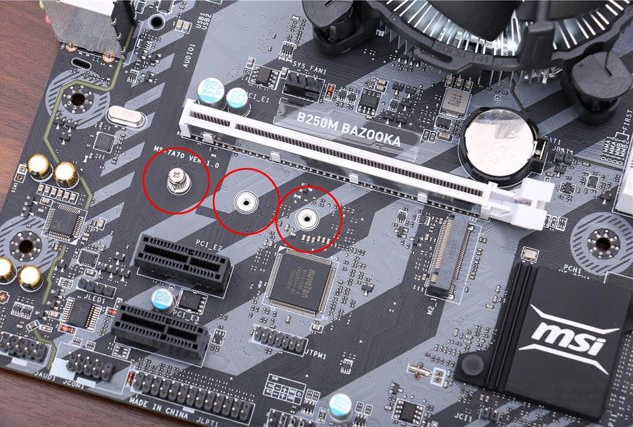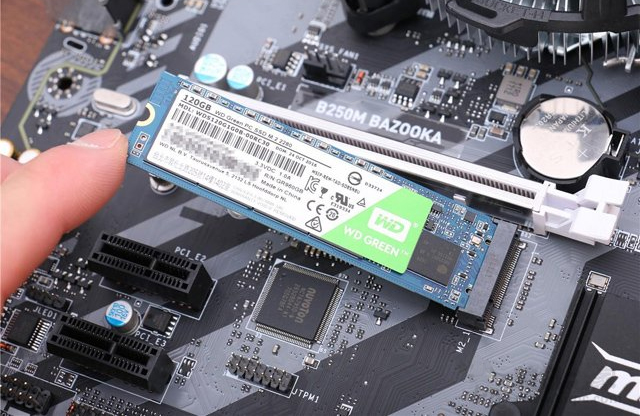 下面我们来安装M.2固态硬盘,主板上可以支持2242/2260/2280三种规格的M.2固态硬盘。M.2固态硬盘安装十分简单,插入M.2插槽中,将固态硬盘按下去,拧上螺丝。【机械硬盘直接接线】