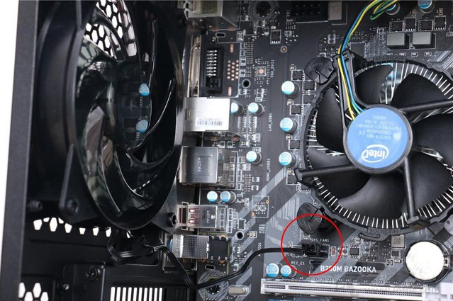 如果机箱自带机箱风扇或者安装了一个风扇,我们将风扇供电线连接到主板的“SYS_FAN”接口,如下图所示。