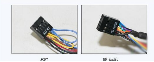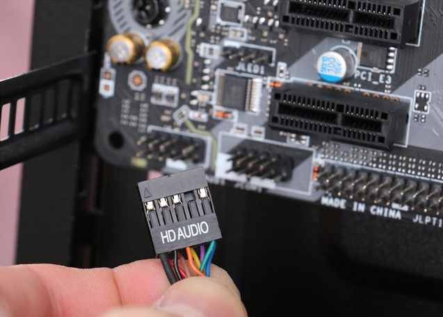 接下来我们连接机箱的前置音频接口,标识为HD AUDIO字样,如下图所示。