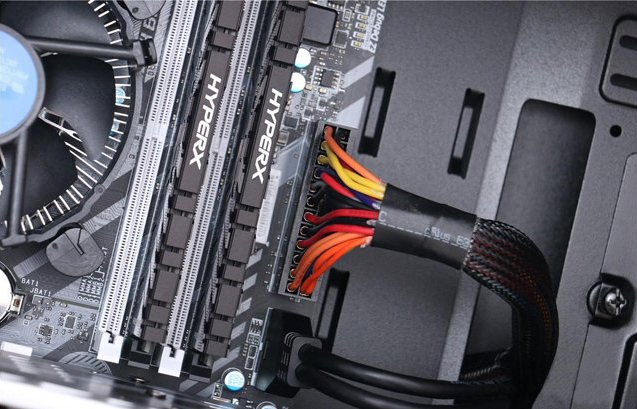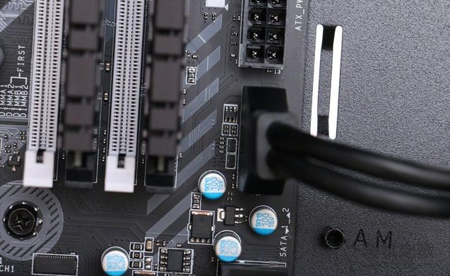 我们找到电源的24pin线,并插入主板对应的24pin插槽中,如下图所示。