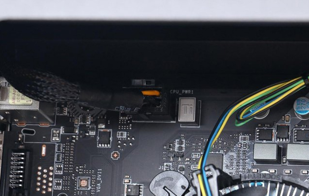 再找到电源上的8pin CPU线(接口上有CPU标识),插入靠近8pin CPU接口中,如下图所示。如果是主板4PIN CPU的插槽,那么可以将8pin CPU线接口处分解 .