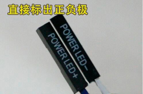 电源灯连线同样是两脚插头,其中一根连线一般用绿色表示,另一根连线为白色。当主机电源启动时,电源灯就会亮起来。此开关连线的插头上一般标有POWER LED 字样,而主板上对应位置的插针附近的英文缩写一般为PW LED、Power LED、PWR LED或PLED+和PLED-等。