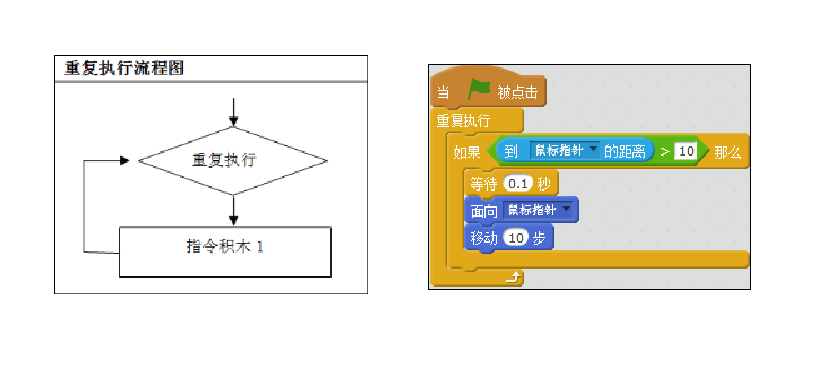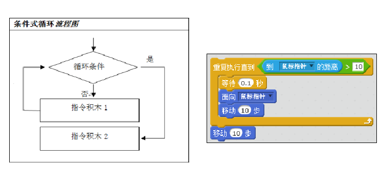 程序中,循环结构会反复执行某一指令积木集,直到特定“条件”出现才停止执行。