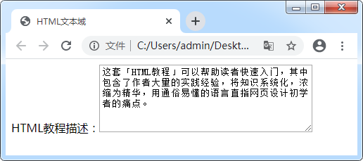 在使用表单时,例如姓名、年龄字段我们可以使用单行文本框,但是当涉及到描述信息,内容比较多时,单行文本框很有可能放不下所有的内容,这时就需要用到多行文本框。在 HTML 中,使用 <textarea> 标签来表示多行文本框,又叫做文本域。与其它 <input> 标签不同,<textarea> 标签是成对标签,它包含起始标签和结束标签,文本内容需要写在两个标签中间。具体语法格式如下: