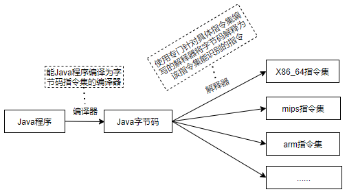 根据不同的平台开发相应的字节码解释器程序,在各个平台上安装这个解释器后,我们的 Java 源代码只需要编译一次,生成字节码文件,然后交给各个平台的解释器就可以直接运行程序。通过解释器, Java 程序可以实现一次编译处处运行。