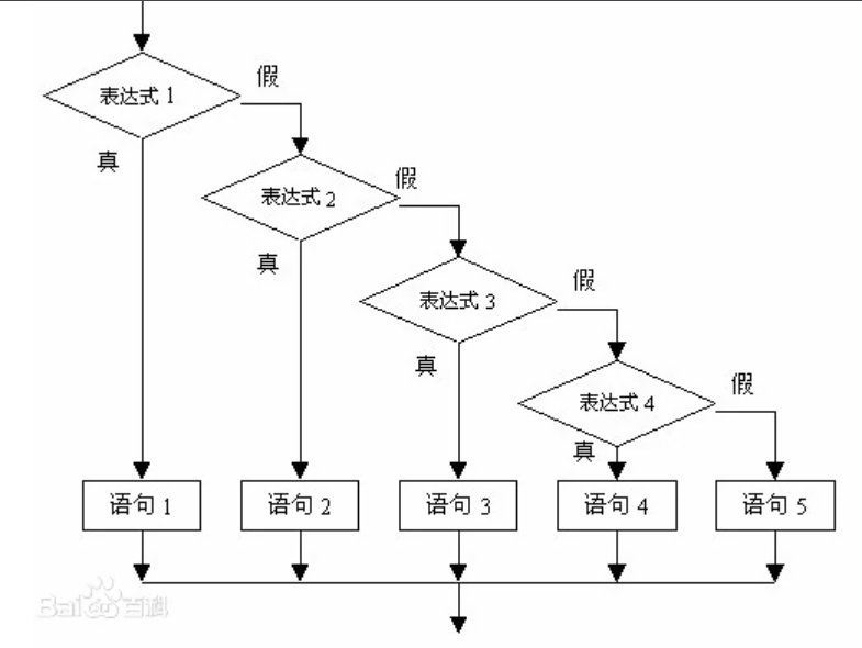 在上面的案例中,我们按顺序判断条件,首先判断 if 中的表达式,为 false 就接着判断第一个 else if 中的表达式,也为 false 又继续判断下一个 else if ,为 true 就执行其中代码,后续就不再判断了。只要 true 出现了就不继续判断,如果 if 和所有 else if 中的表达式都为 false,则实现 else 中的代码。