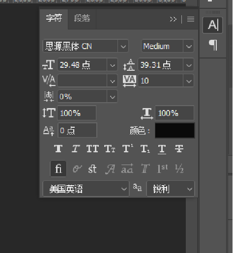 在文字工具选项栏上点击显示字符和段落面板,这里我们一样可以设置字体类型、字体大小、以及字体颜色,点击设置行间距,选择36点。