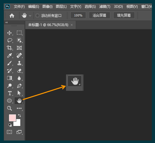 在工具栏中单击抓手工具,或者执行快捷键命令H,按住鼠标左键不放移动画布位置。这样,我们就完成了“抓手工具”的操作了。或者在任意工具下,按住空格键加鼠标左键拖拽就可实现移动画布位置
