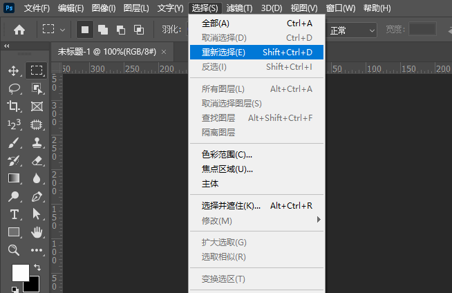 单击选择菜单,找到重新选择,或者执行快捷键命令Ctrl+Shift+D,点击重新选择。