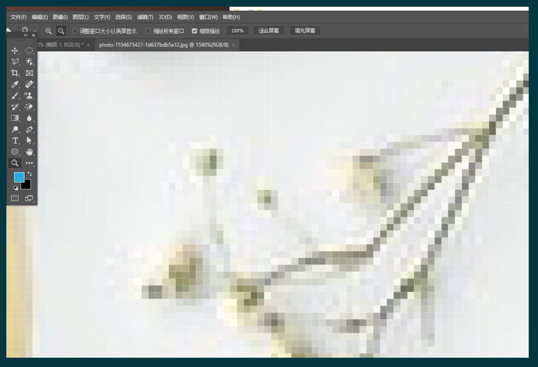 放大画布,这时,我们会看到图像的像素点,这里,一个色块代表着一个像素点。