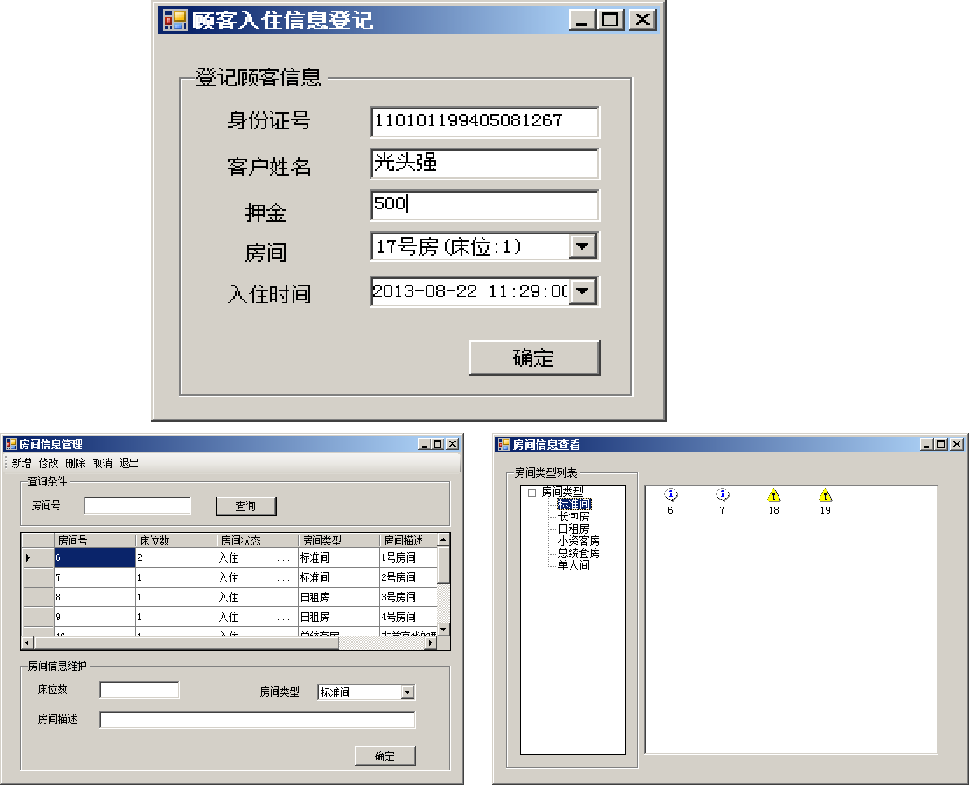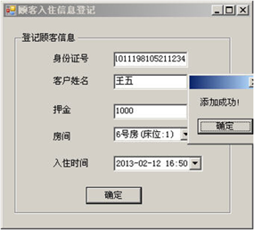 - 可录入身份证号、姓名、押金、房间和入住时间