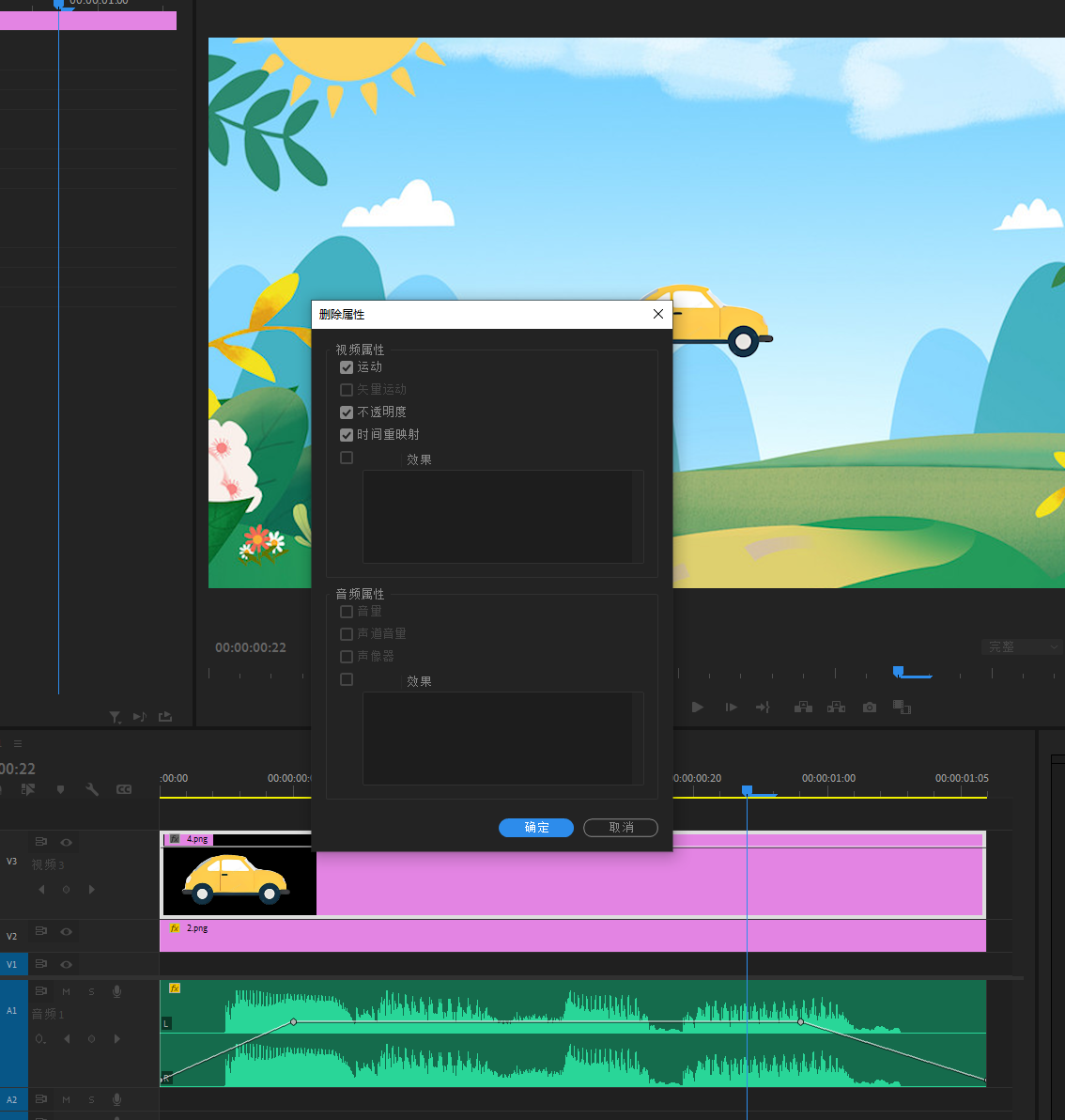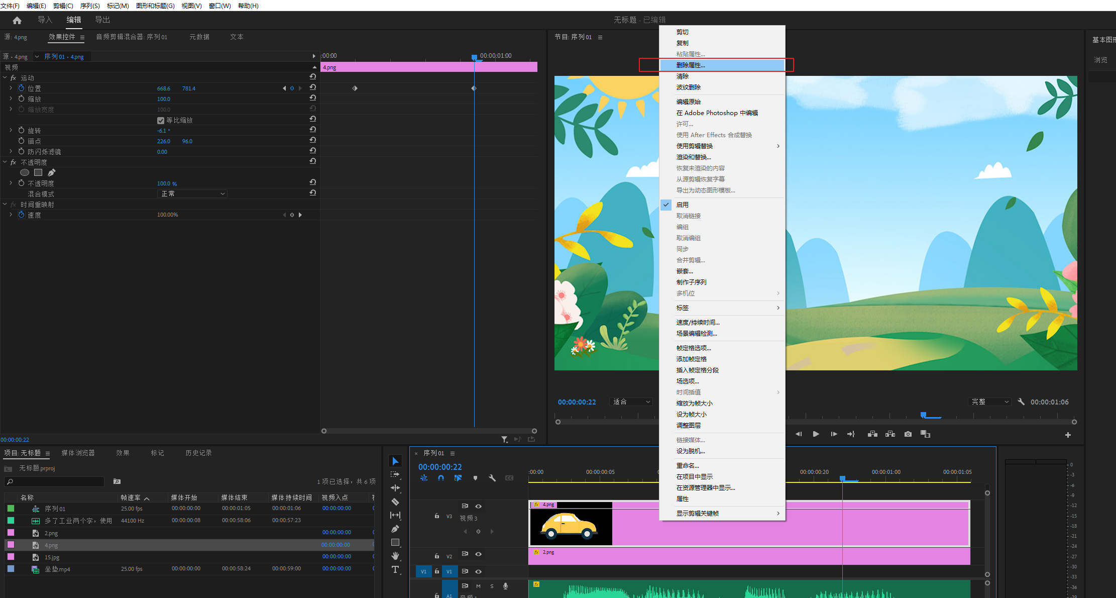 操作方法:选中需要清除属性的素材,然后点击鼠标右键找到删除属性,然后点击。在点击的时候会会弹出一个面版,就是让你选择需要删除哪一项属性,一包都保持默认。默认就是删除所有属性。