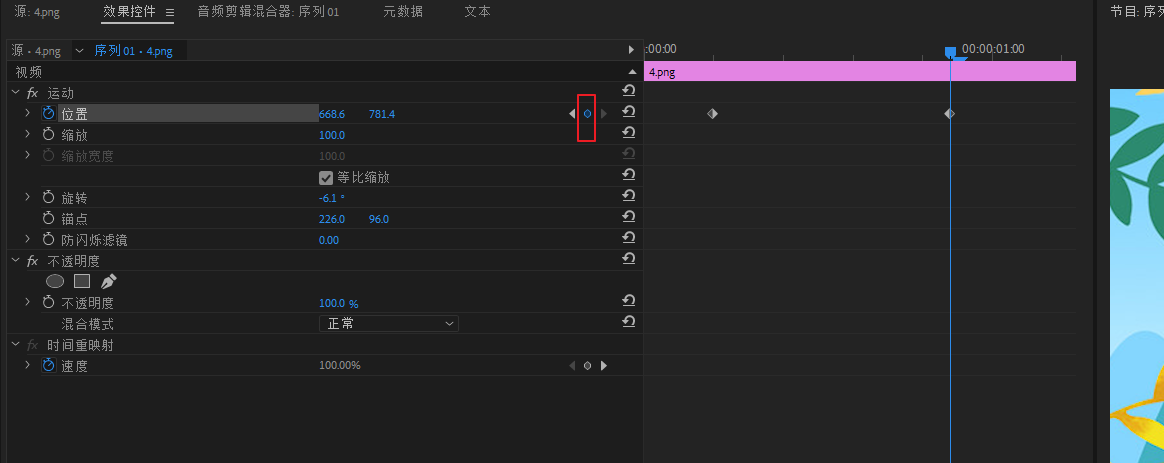 将时间线指针拉到最开始处,选中图片素材,使用钢笔工具制作跟随钟表摆动的关健帧