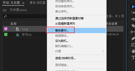 操作方法:在项目面版里找在需要替换的素材,然后点击鼠标右键找到替换素材按键,接着指定新素材点击选择。