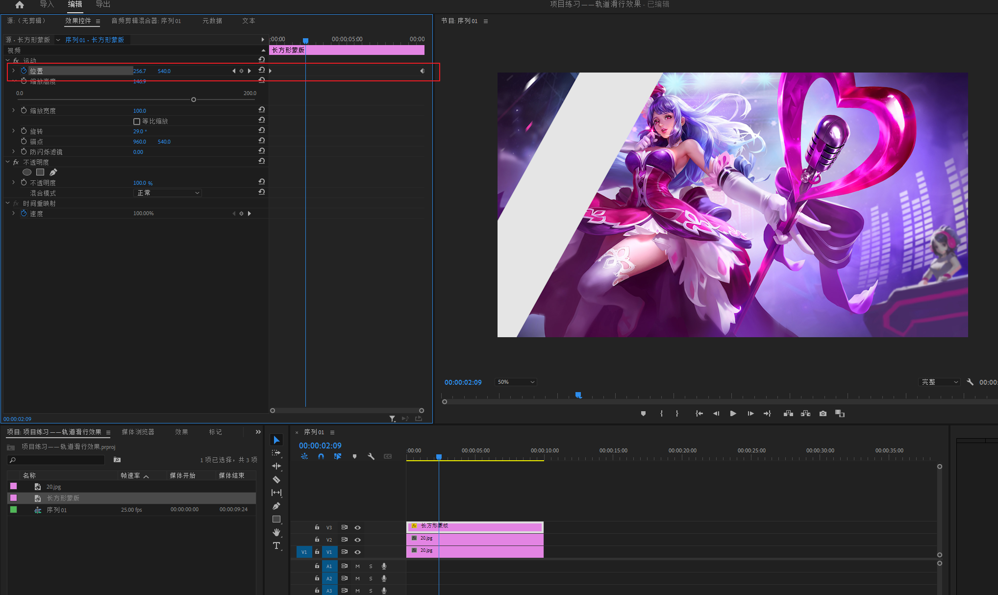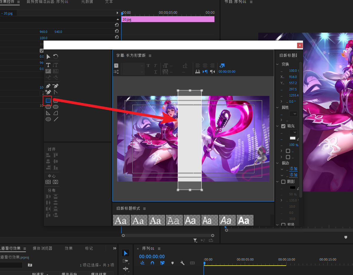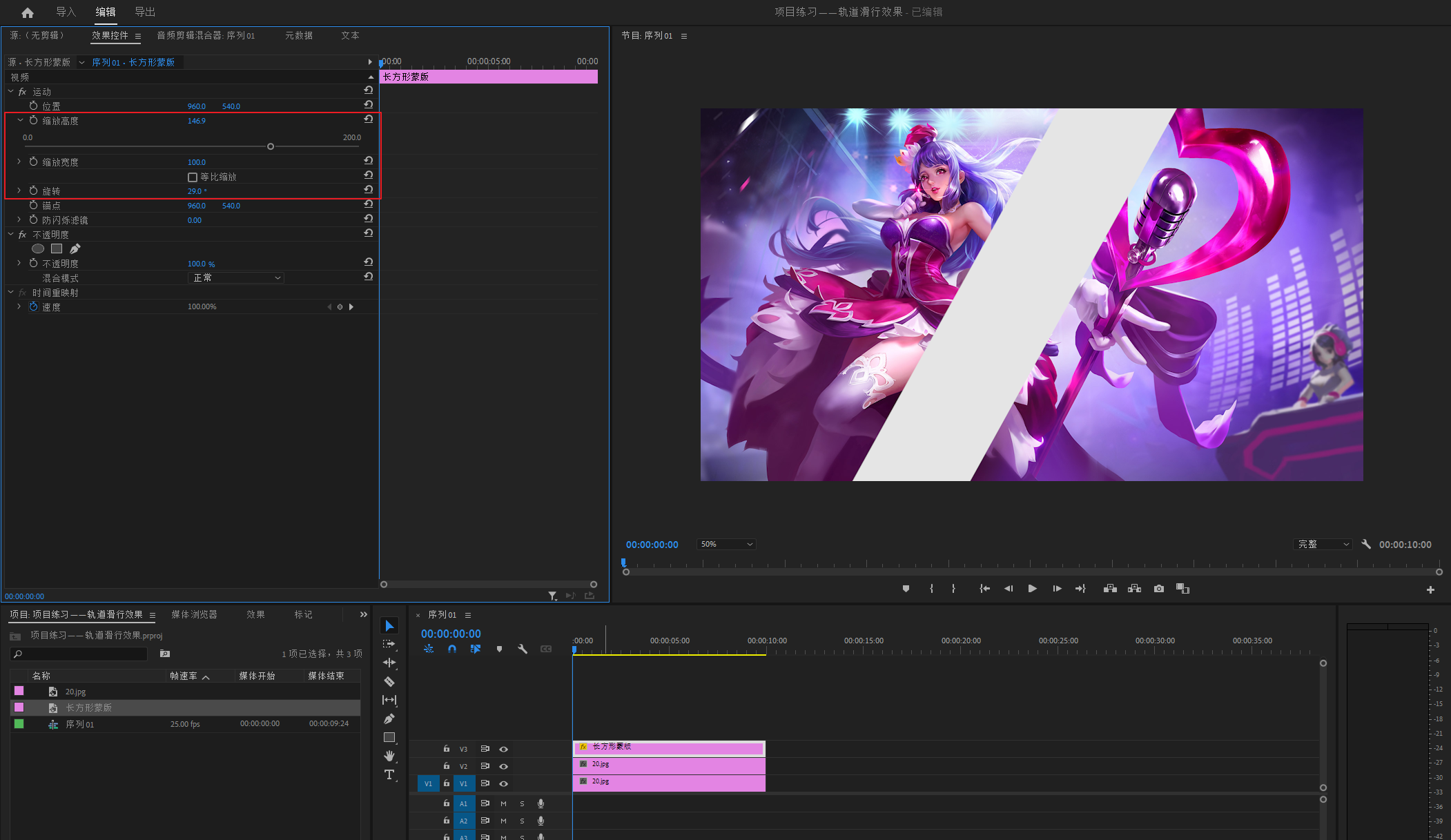 调整长方形蒙版的旋转还有高度,先关闭等比缩放再调整高度。