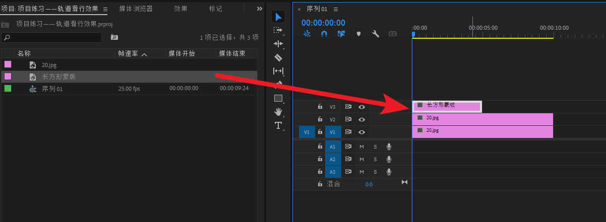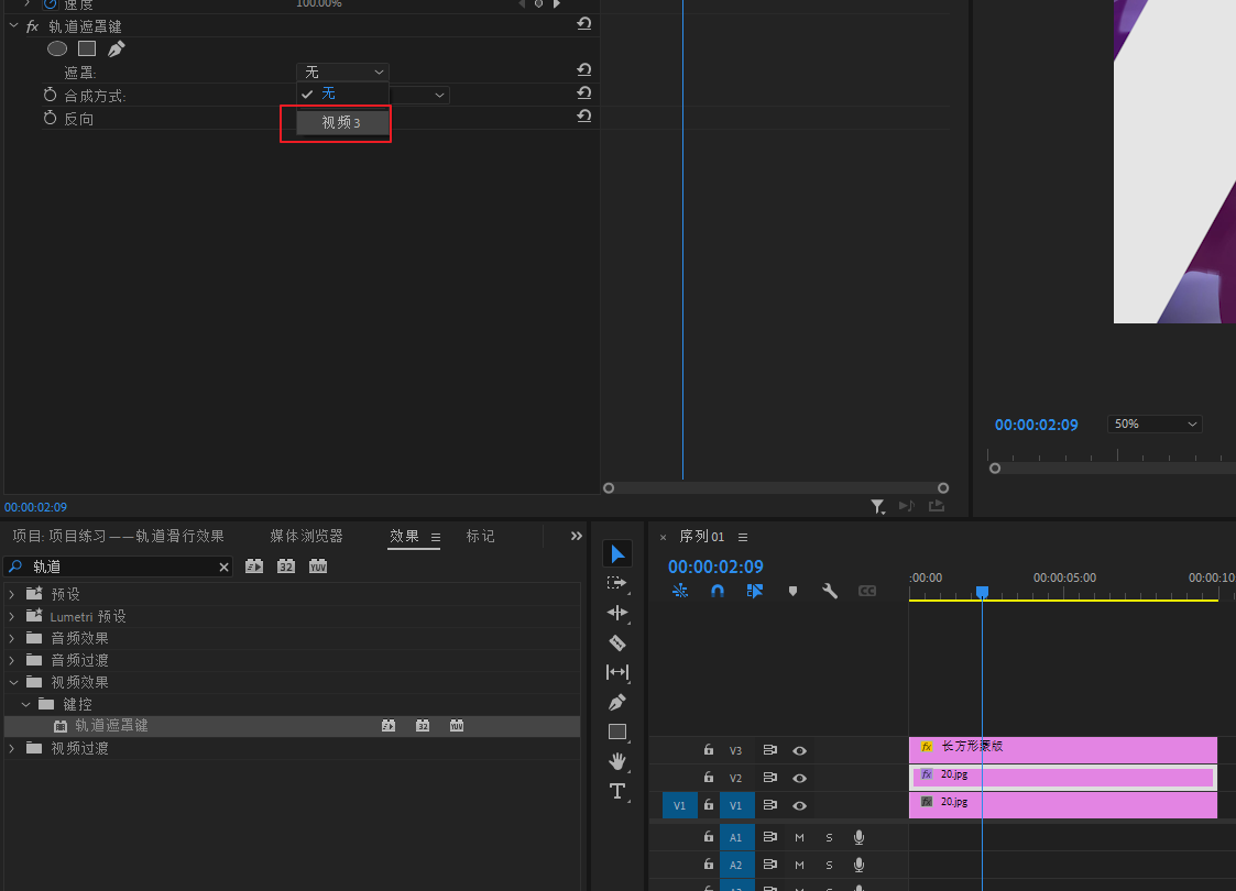 将轨道遮罩键属性的遮罩选择V3轨道也就是视频3轨道