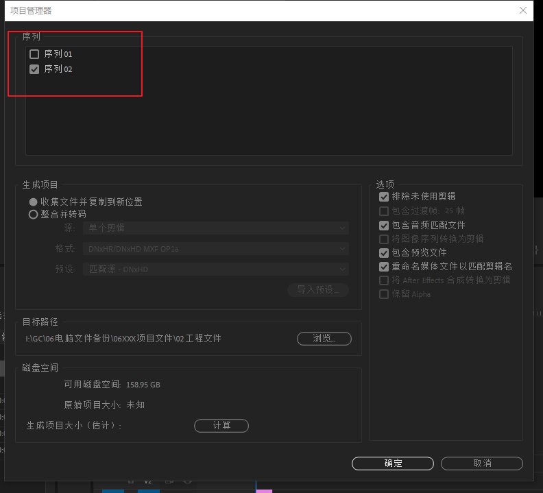 如果该PR工程有多个序列工程,然后想打包哪一个序列,就勾选哪一个。默认勾选的是时间线上当前显示的序列。