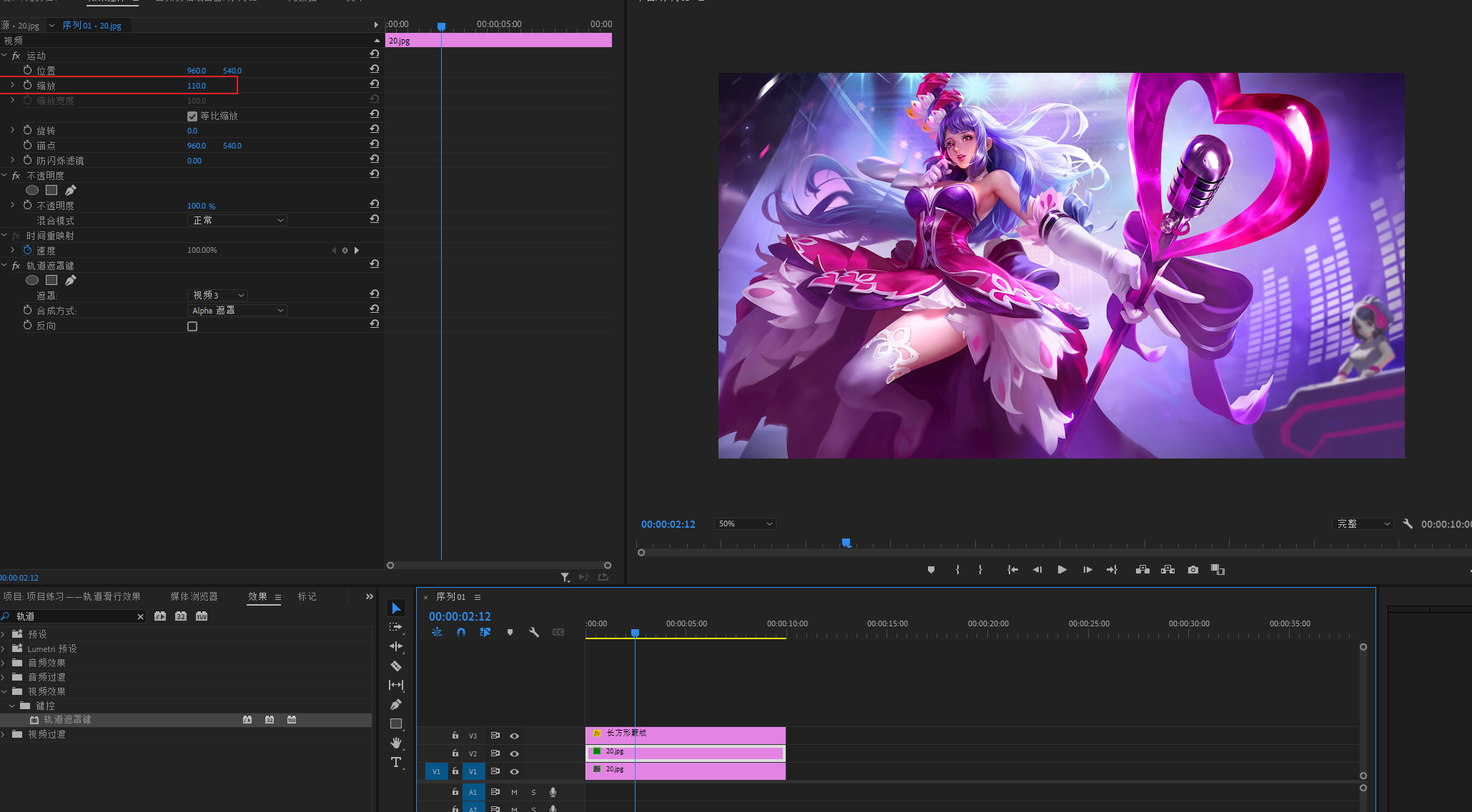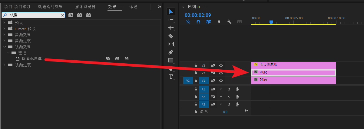 在效果面版找到“轨道遮罩键”将它拖到V2轨道素材