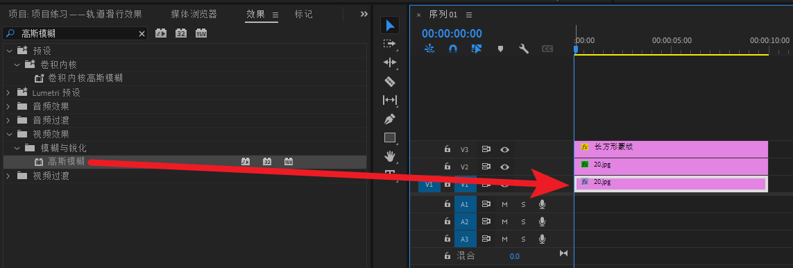 在效果面版搜索“高斯模糊”将它加到V1轨道素材