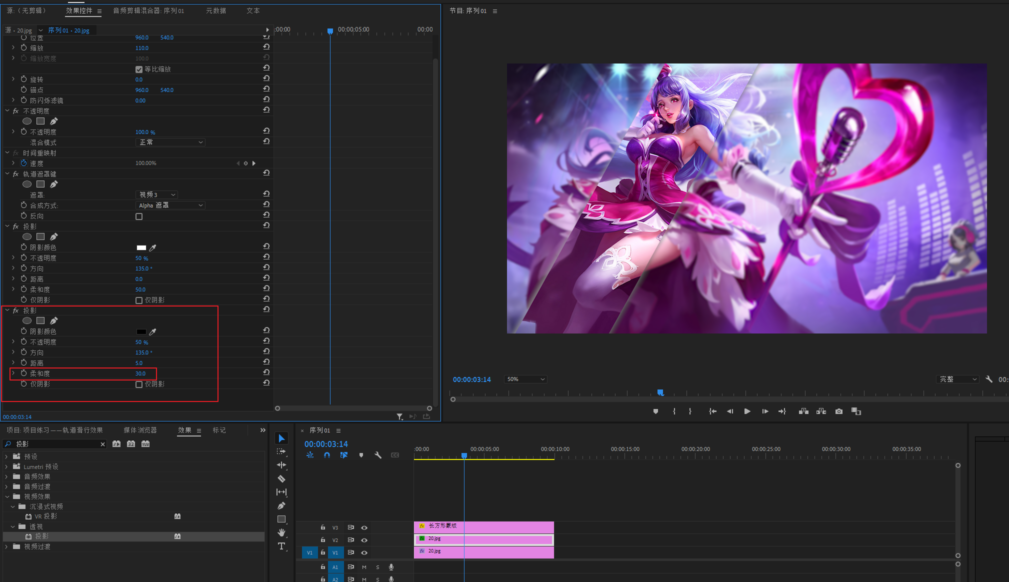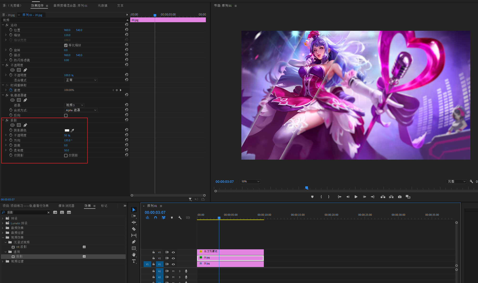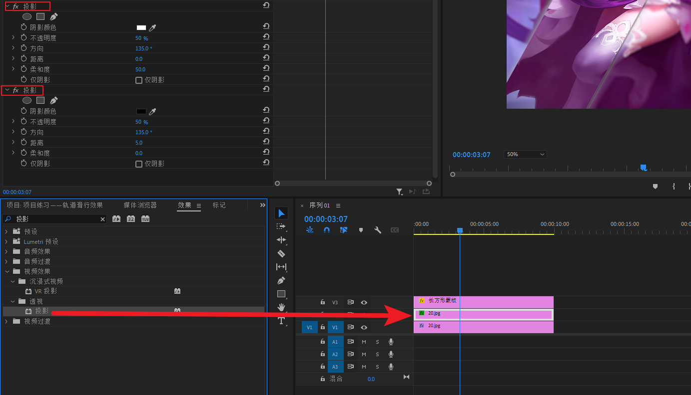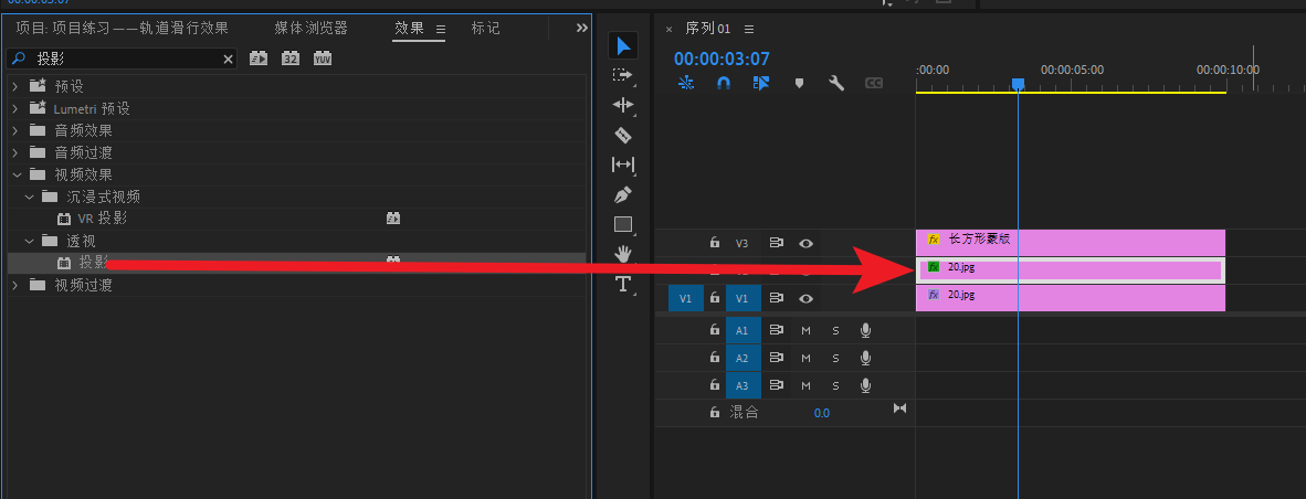 在效果面版搜索“投影”拖拽到V2素材上,给它增加厚度