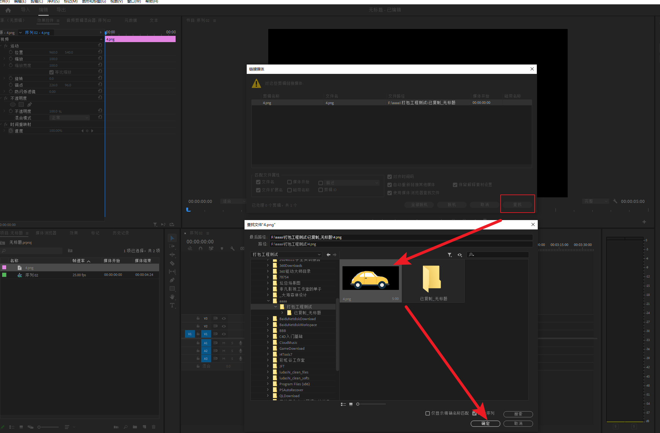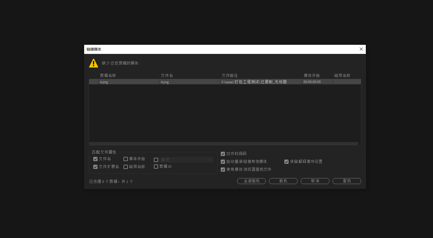 2.可以在提示脱机的弹窗里点击取消,进到PR工程里。然后在项目面版找到丢失的问号素材图标,选中单击鼠标右键选择链接媒体。然后又会回到提示脱机弹窗,然后点击查找重新找到素材,然后点击确定。