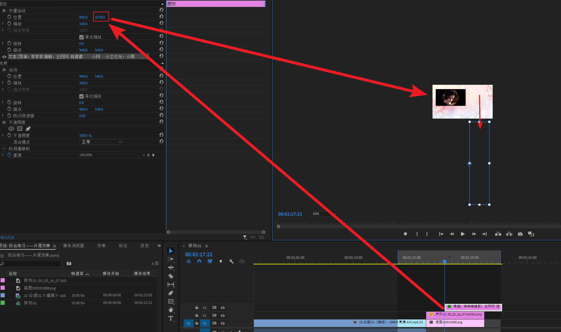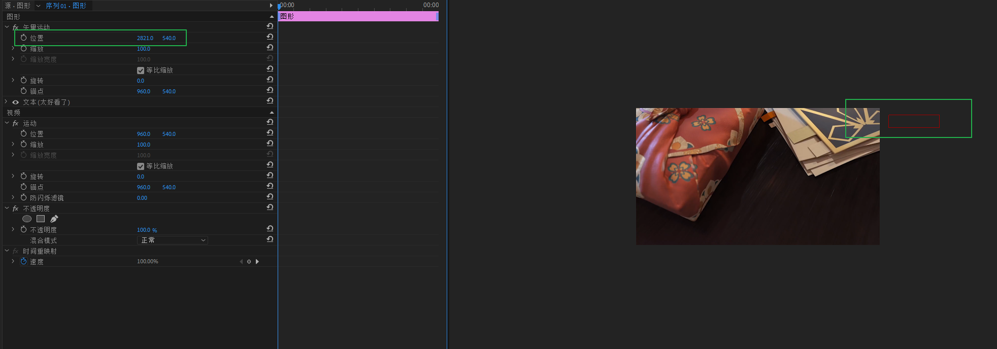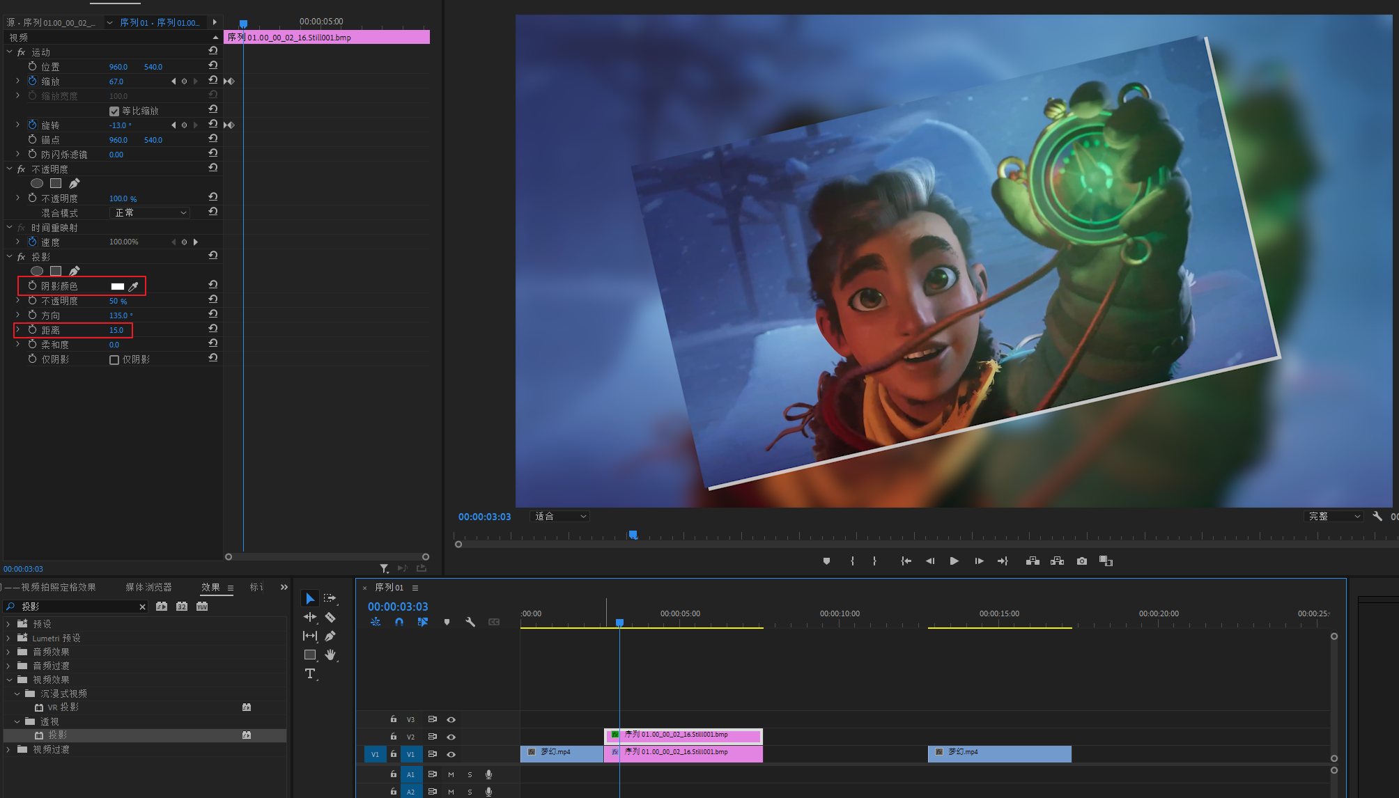 选择V3轨道的素材,打开变换属性,给旋转和位置打上关健帧,做一个掉落的效果