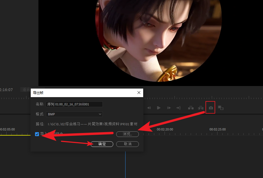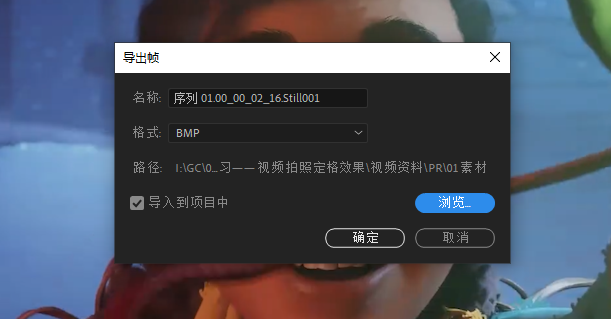 将这个画面导出帧,选择好保存位置,再勾选导入到项目中