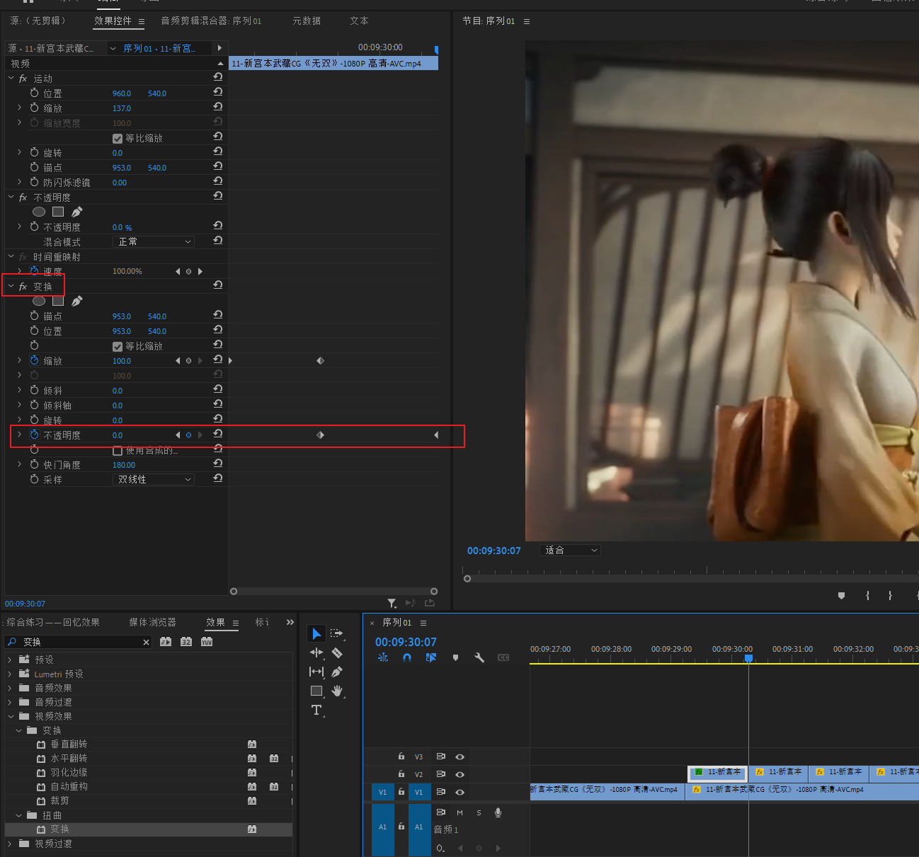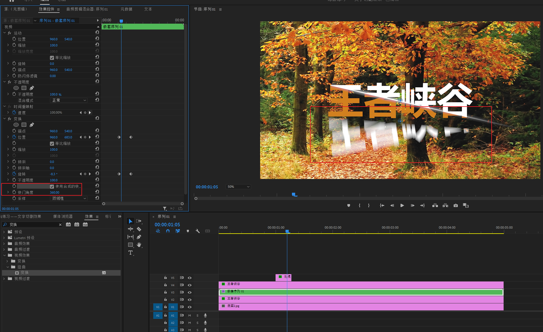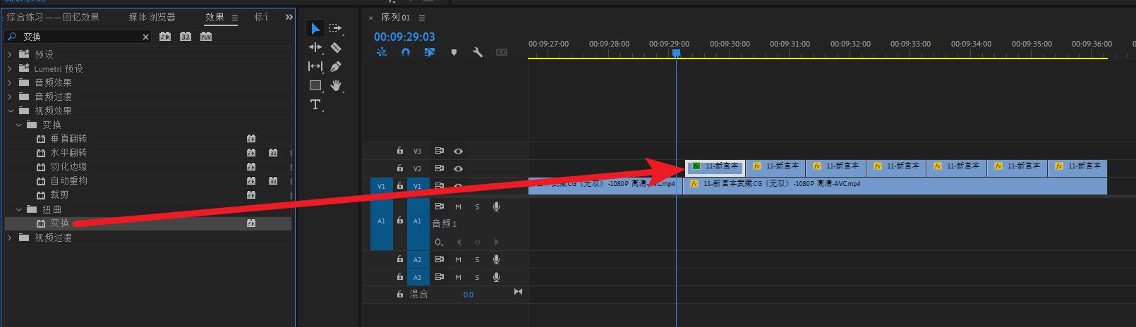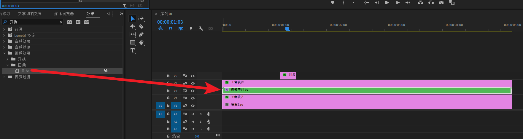 搜索“变换”特效,加给V3轨道的嵌套素材