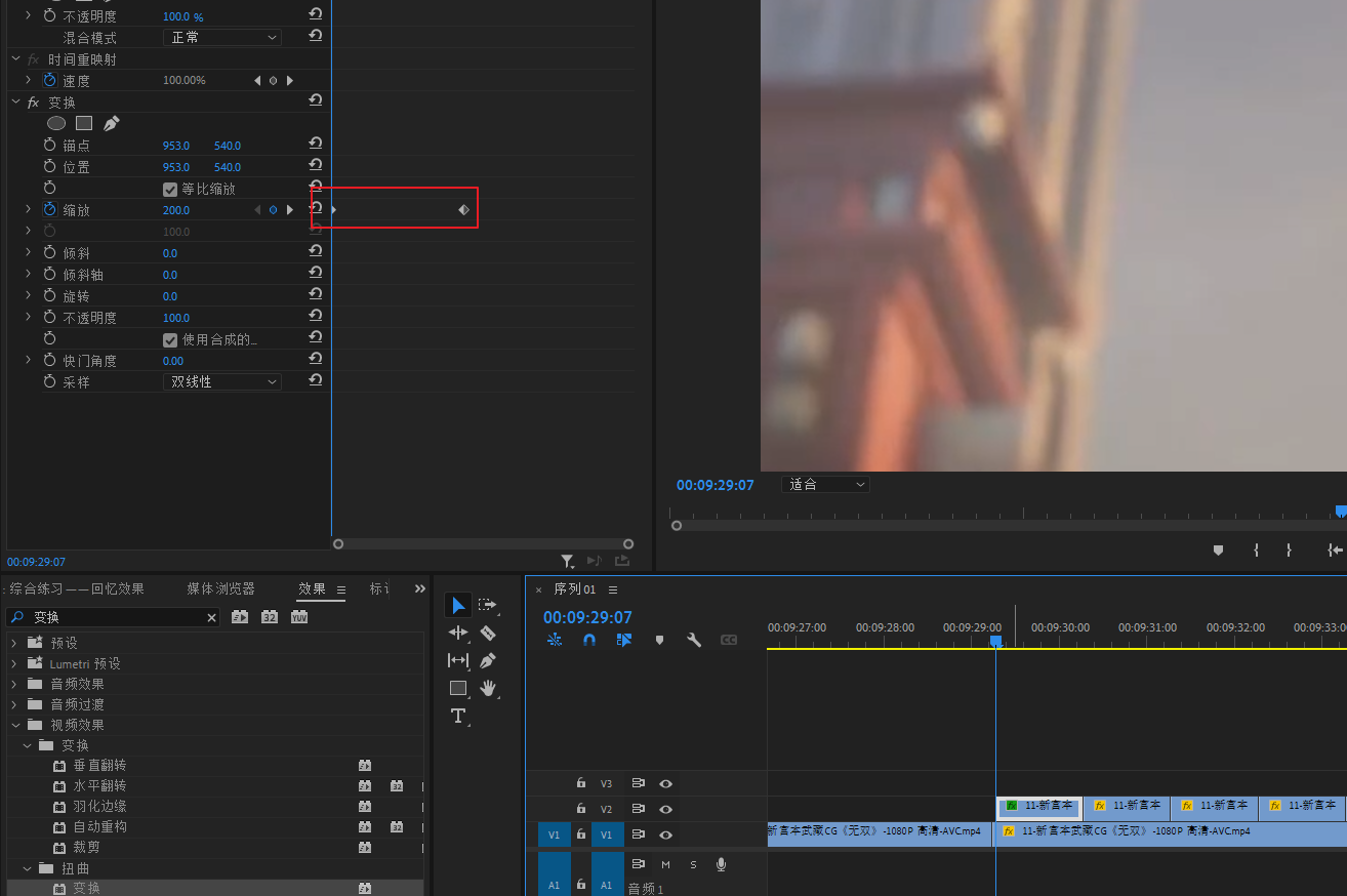 然后选择V3轨道的素材,打开变换的缩放参数,做缩放动画