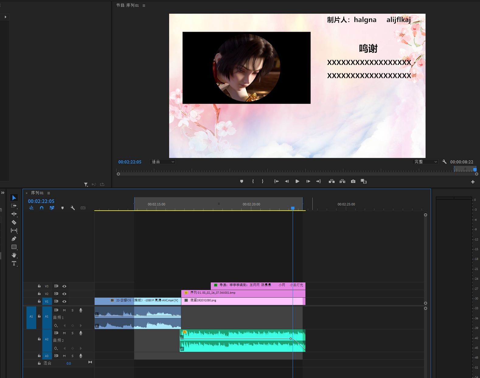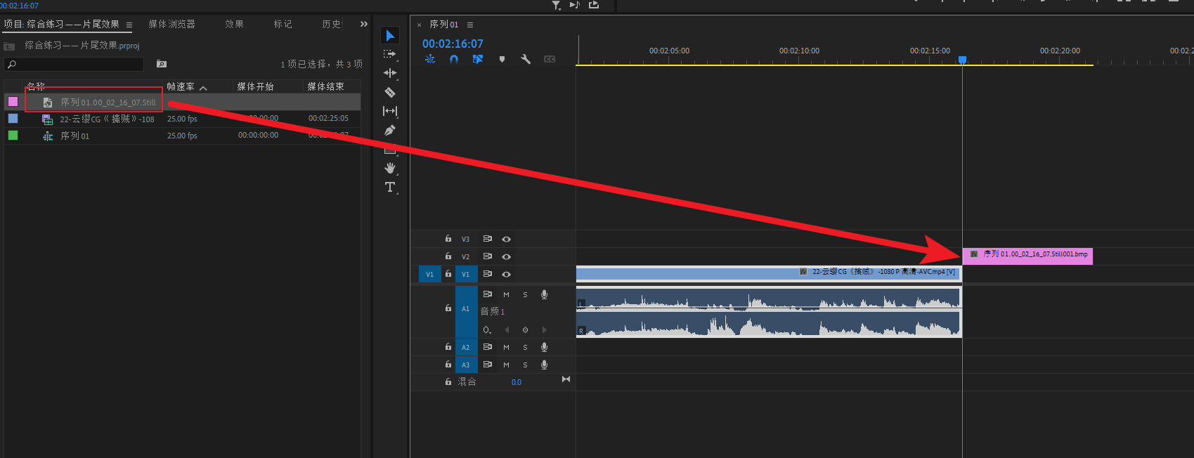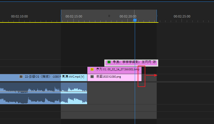 将刚才导入的图片拖拽到视频结尾的V2轨道上,V1轨道留着加底图