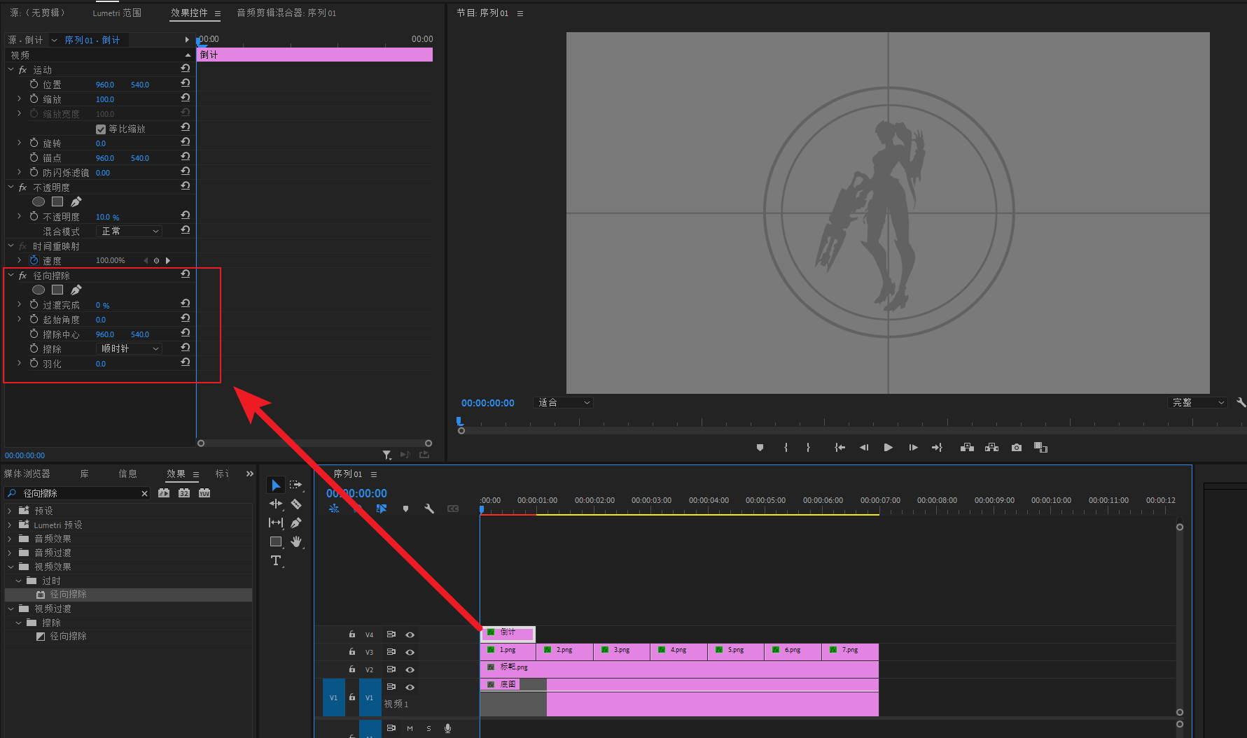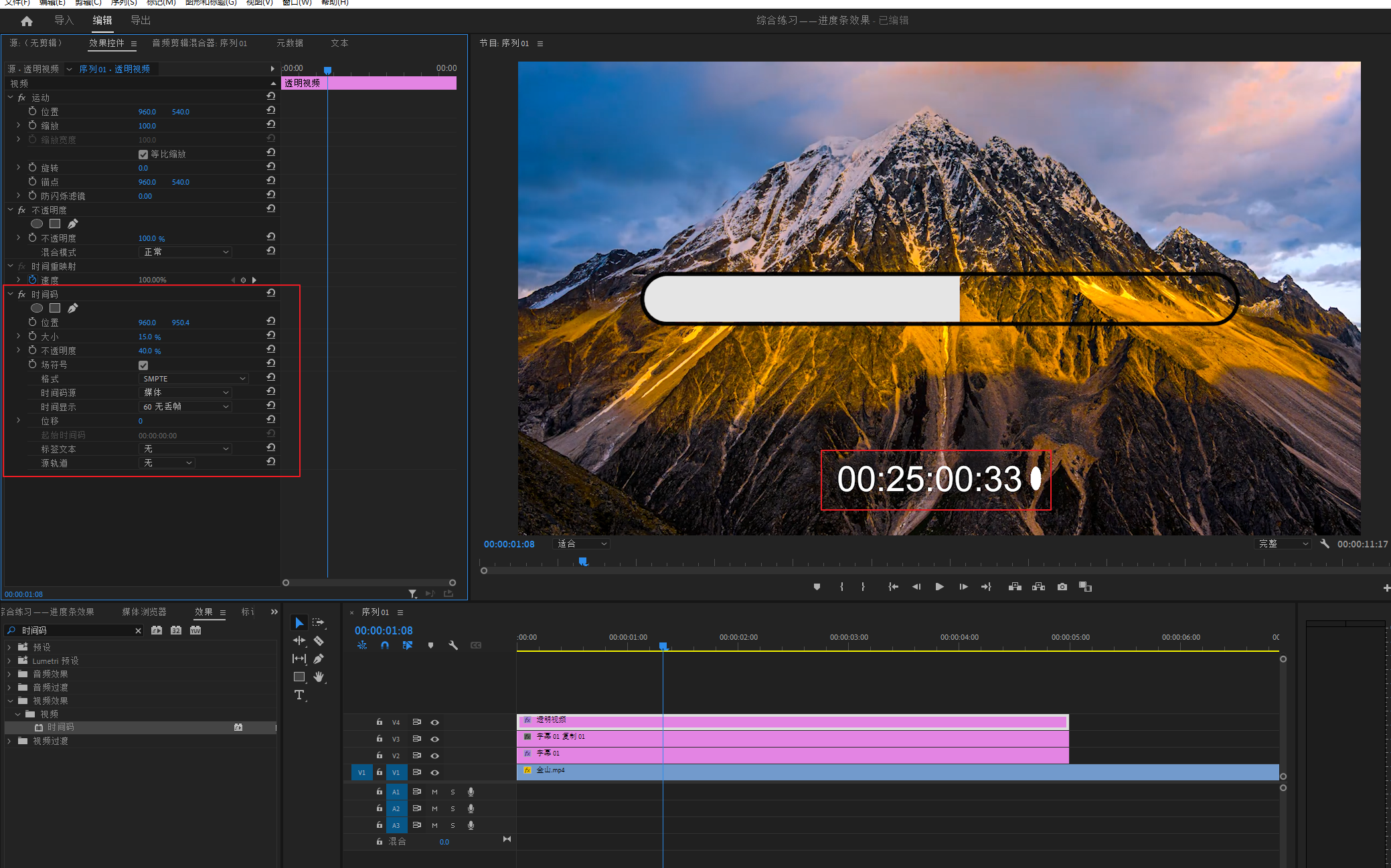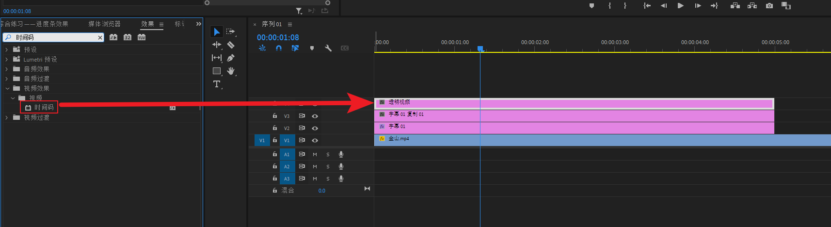 将“时间码”效果,加到V4轨道的透明视频上