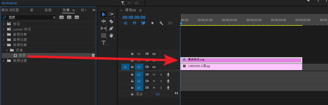 将“裁剪”效果添加给V2轨道的素材