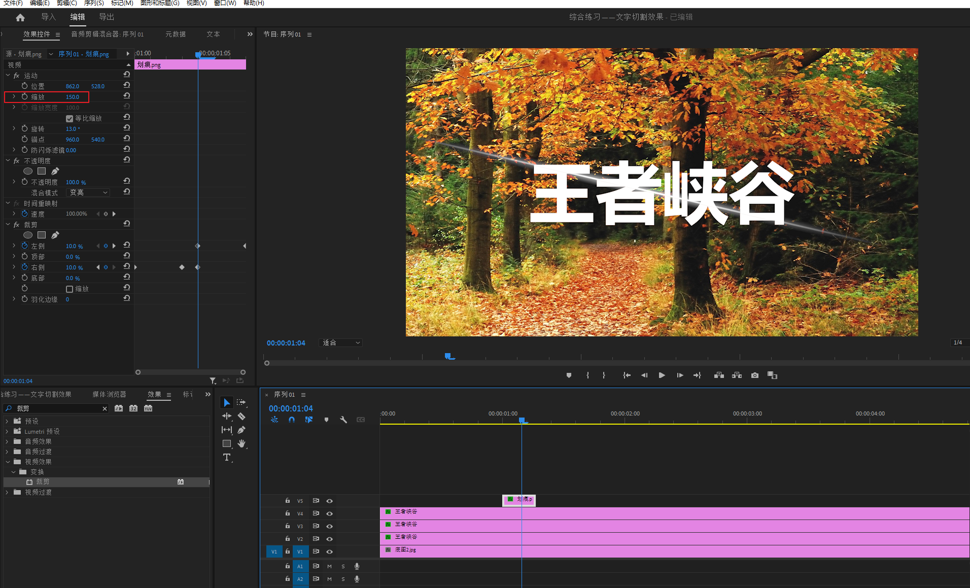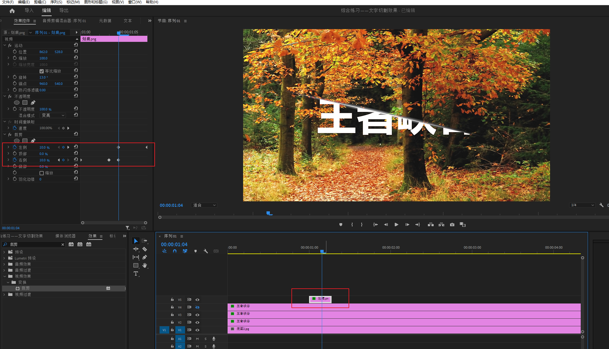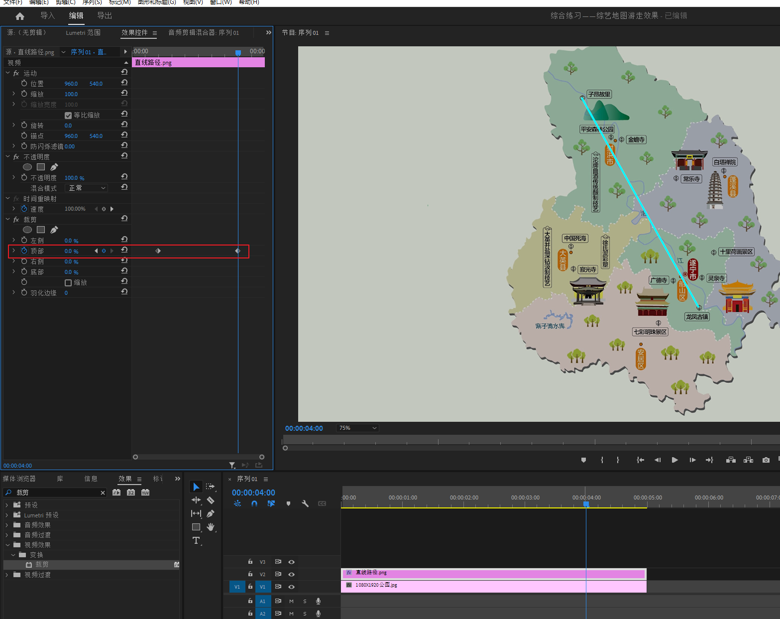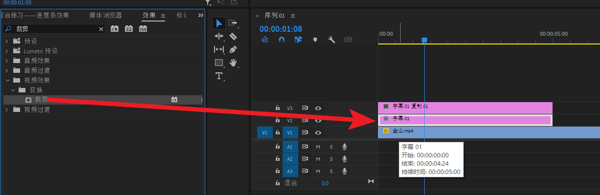 选中V2轨道素材,也就是加有裁剪效果的哪一个,然后打开裁剪效果的关健帧,将后面的一个关健帧拖动到100帧,以对应时间码的100