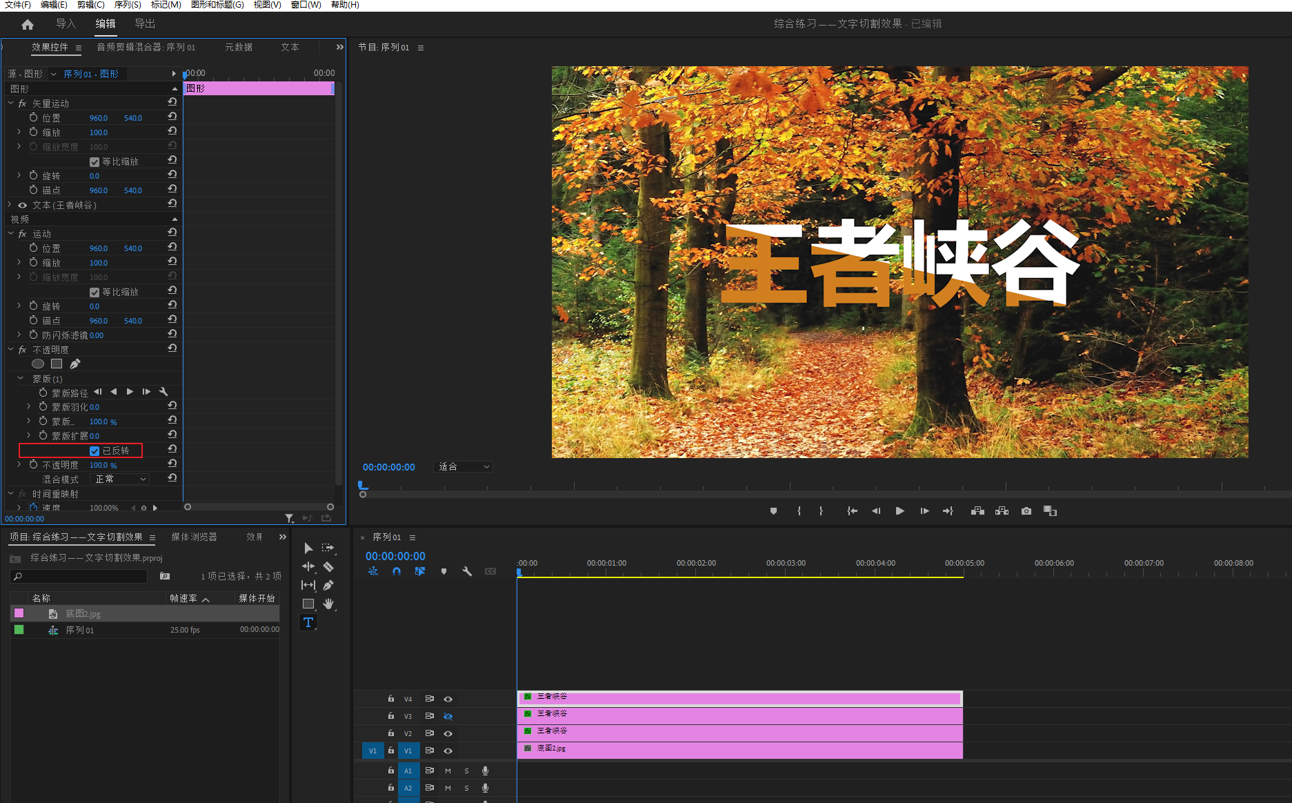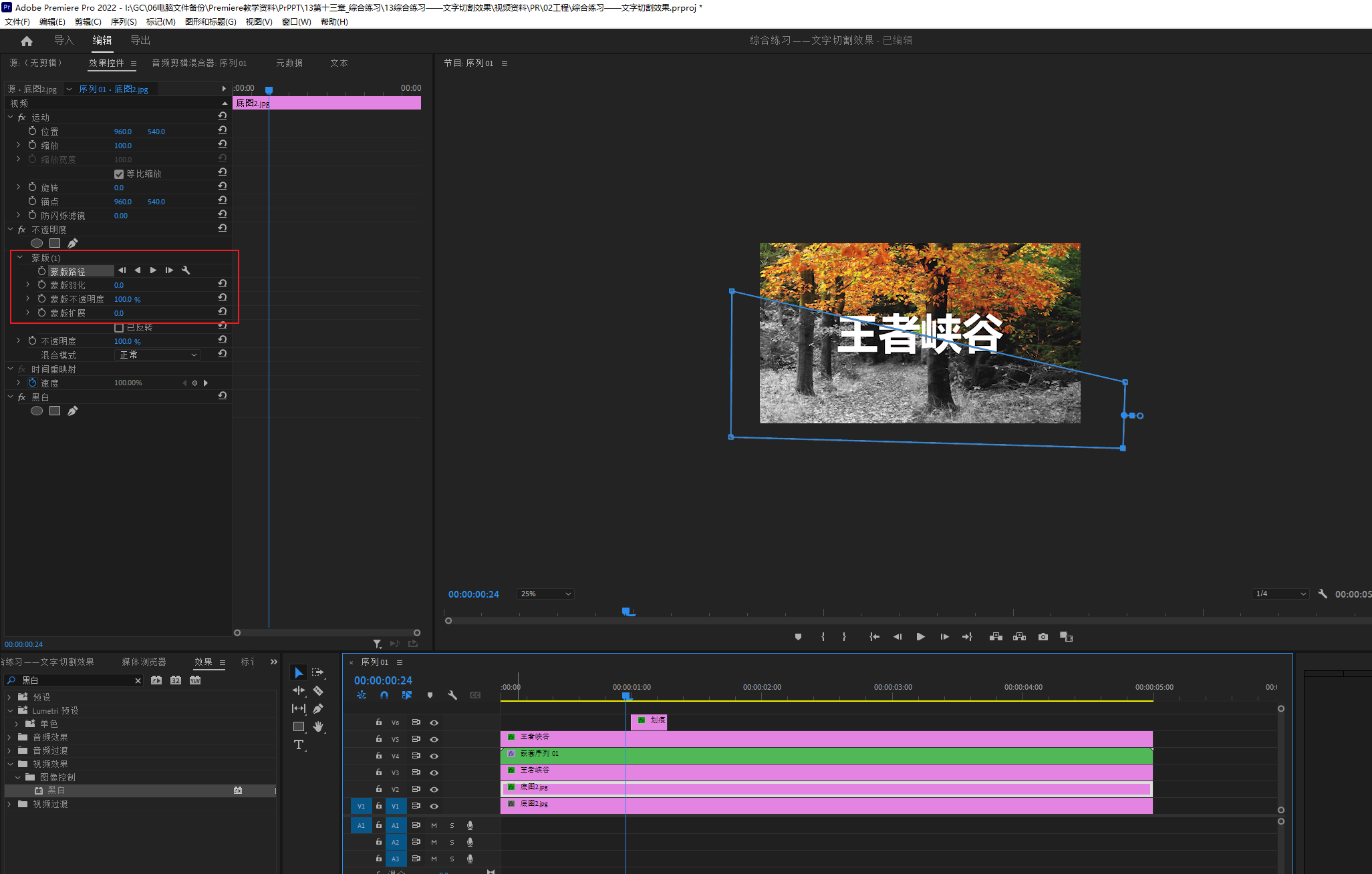 选中V2轨道底图2素材,在不透明度属性下画一个蒙版,羽化改为0,让切口以下部分变黑白