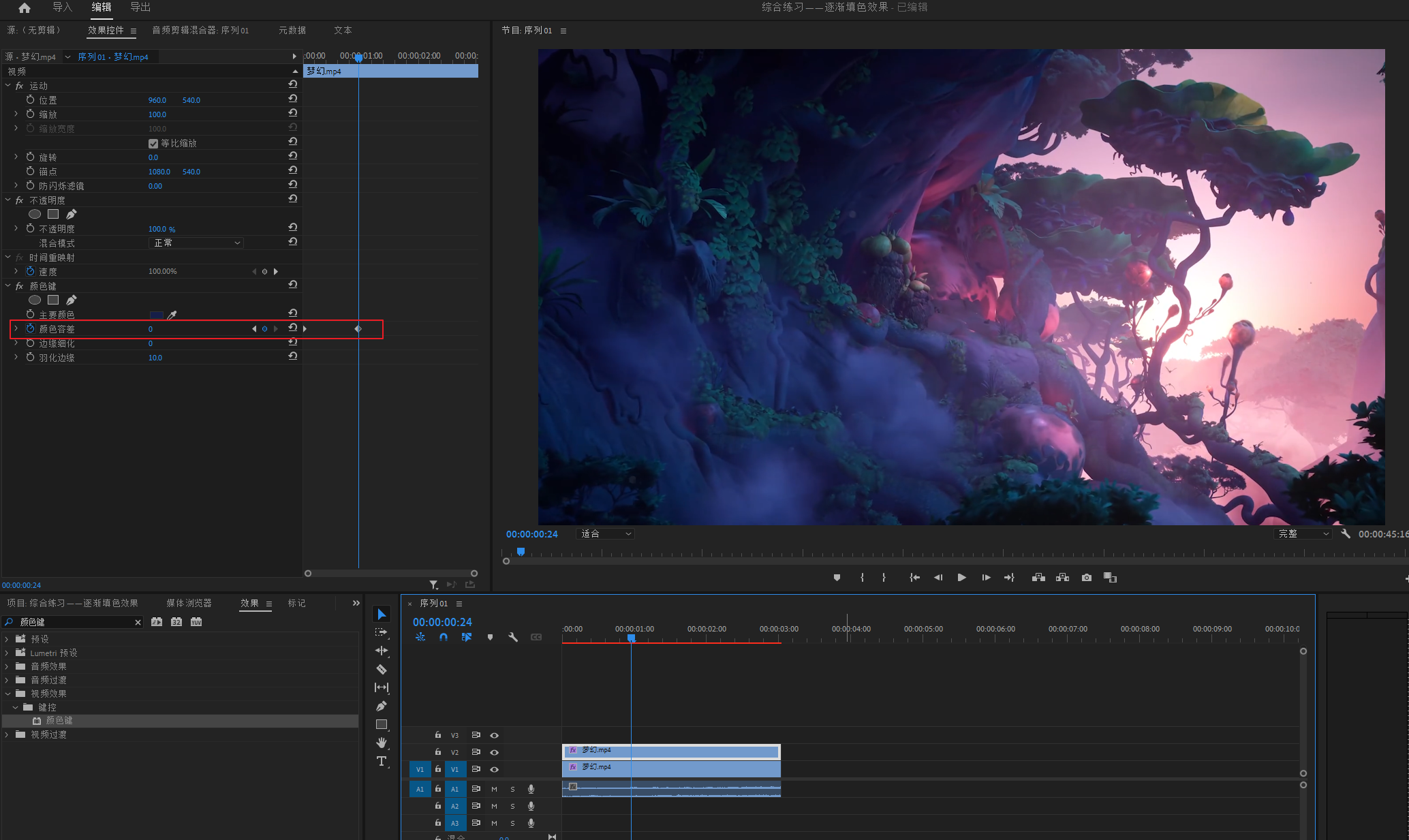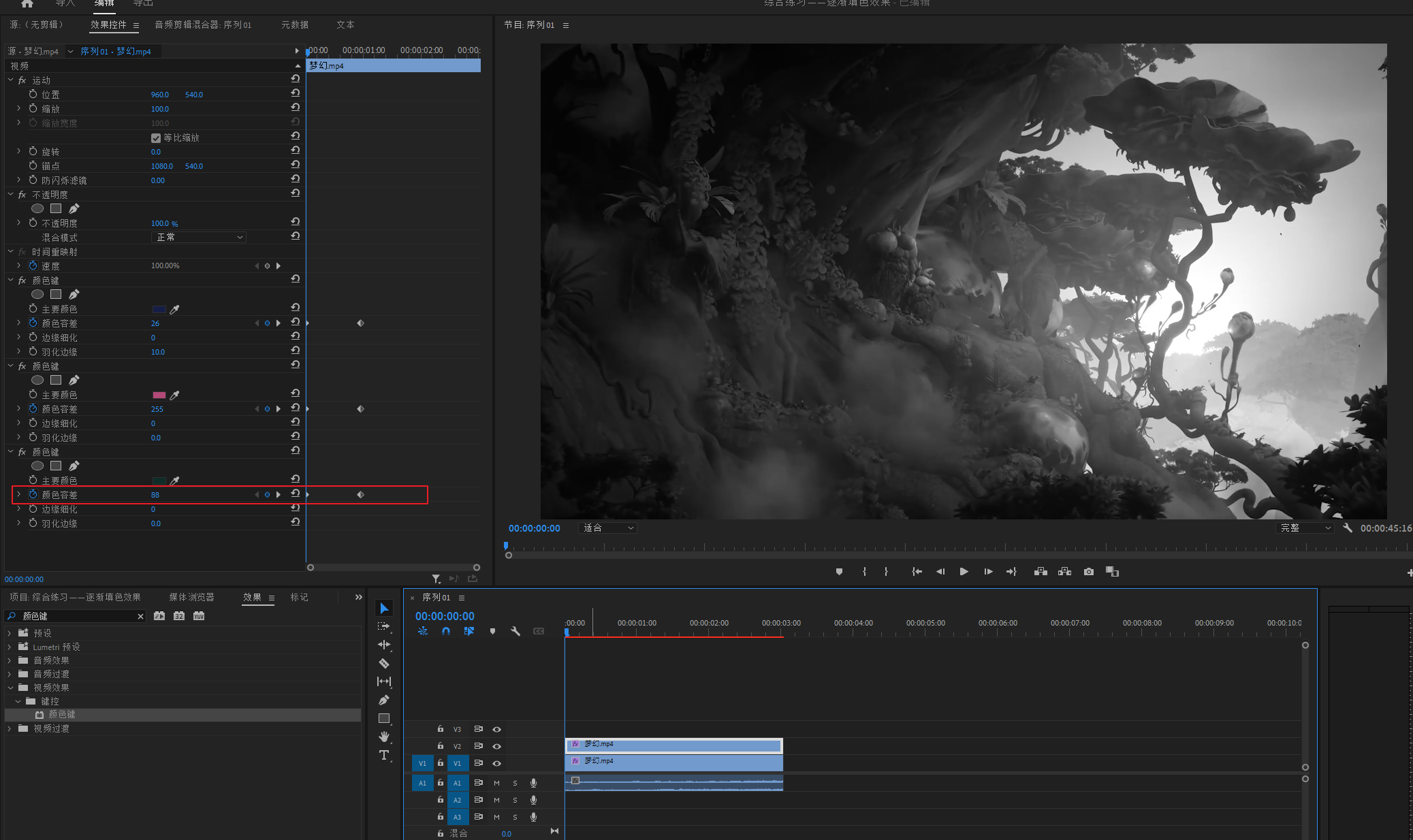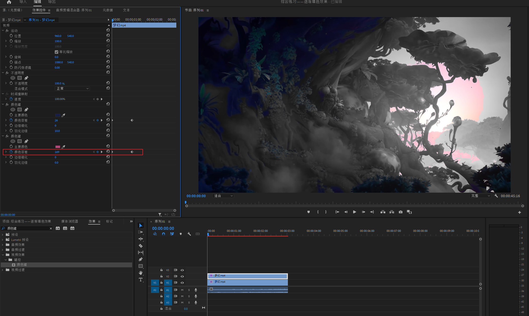 打开颜色键属性,吸取一个颜色调节颜色容差做恢复动画