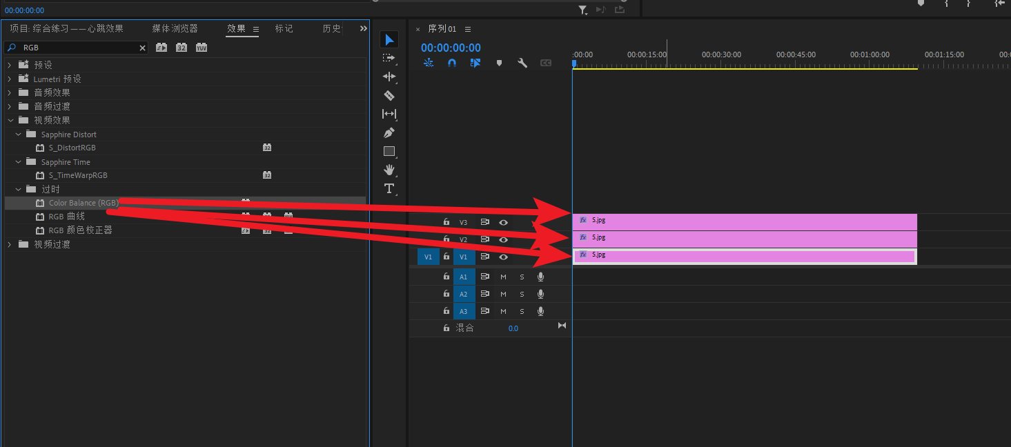 在效果面版搜索“Color Balance(RGB)’’或者是”颜色平衡RGB”,软件版本不同效果名字不同。将它添加给三层素材,每层一个。