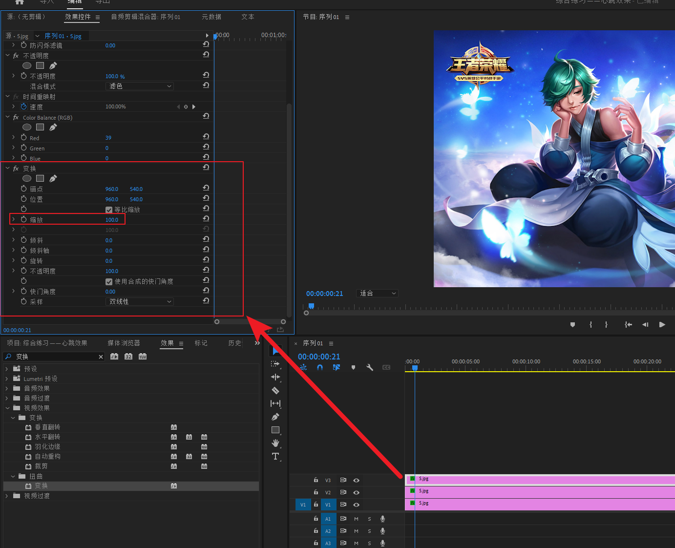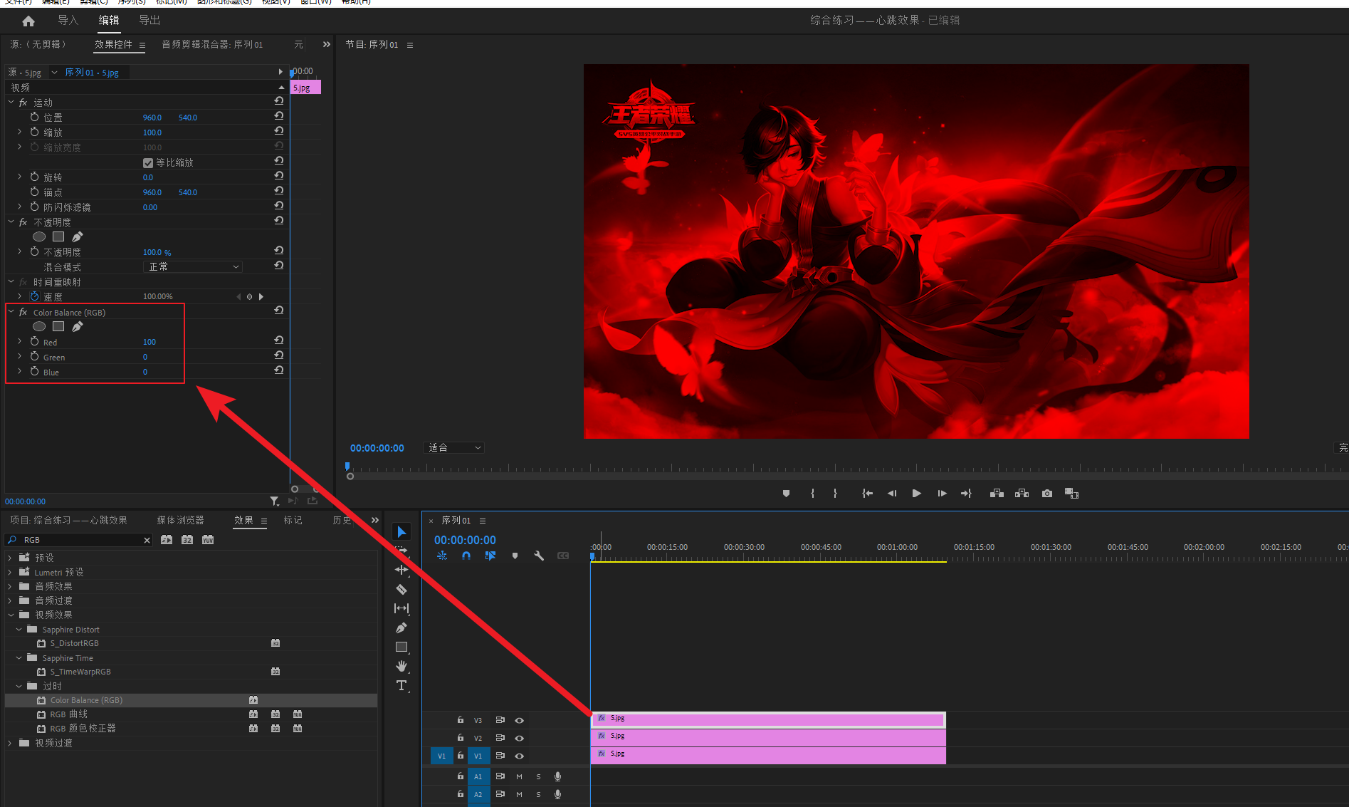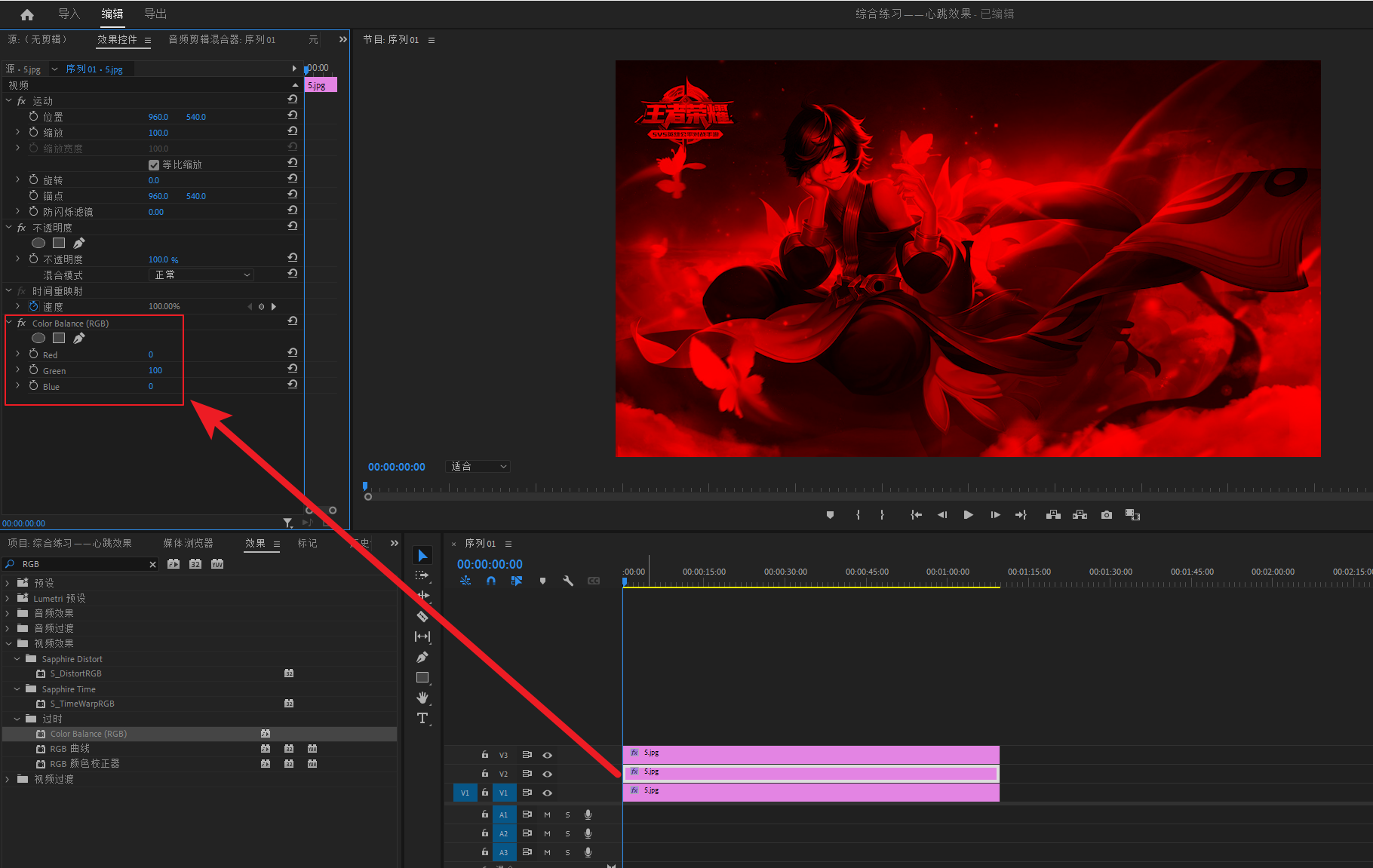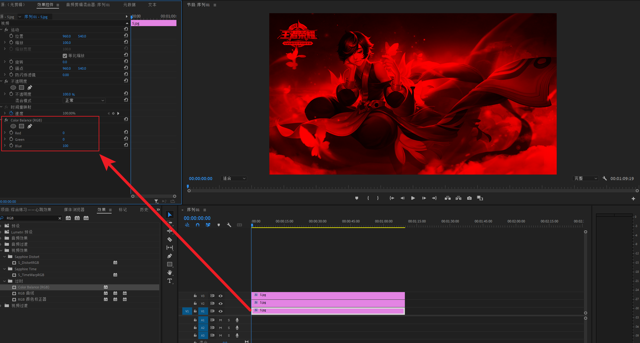 选中V3轨道素材,打开Color Balance(RGB)效果的参数,更改参数为 :Red 100、Green 0、Blue 0.(数值改为100,但是会转换为39。这是软件问题,不影响)