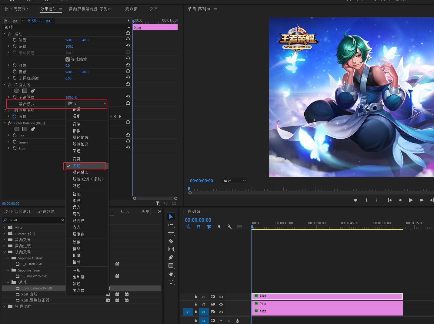 然后将V3、V2、V1轨道的素材混合模式都改成“滤色”
