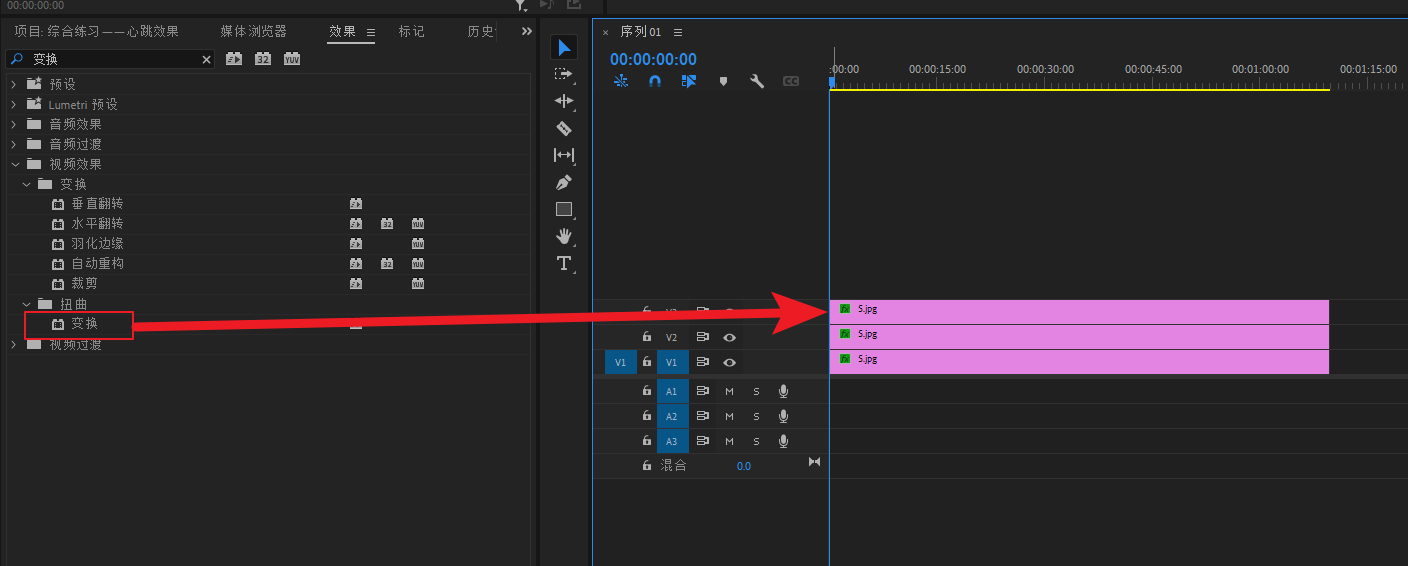 在效果面版找到“变换”,将它添加到三条轨道中随便一条轨道的素材,这里添加到V3轨道的素材