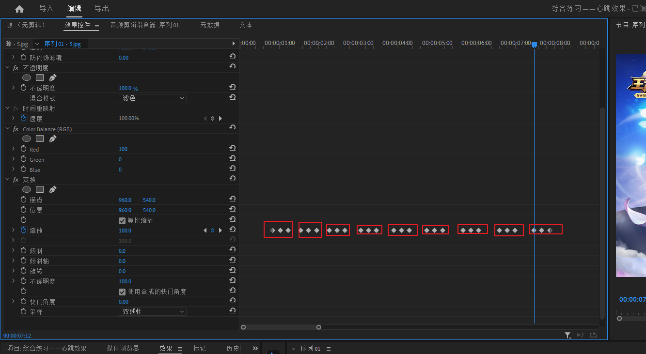 将这三个关健帧复制粘贴多几次,就可以得到很多次心跳的效果