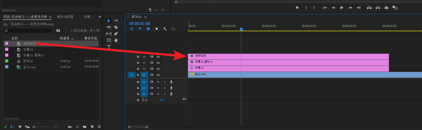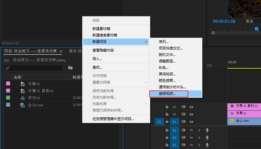 将透明视频直接拖到V3轨道上方,就会自动新建一个V4轨道