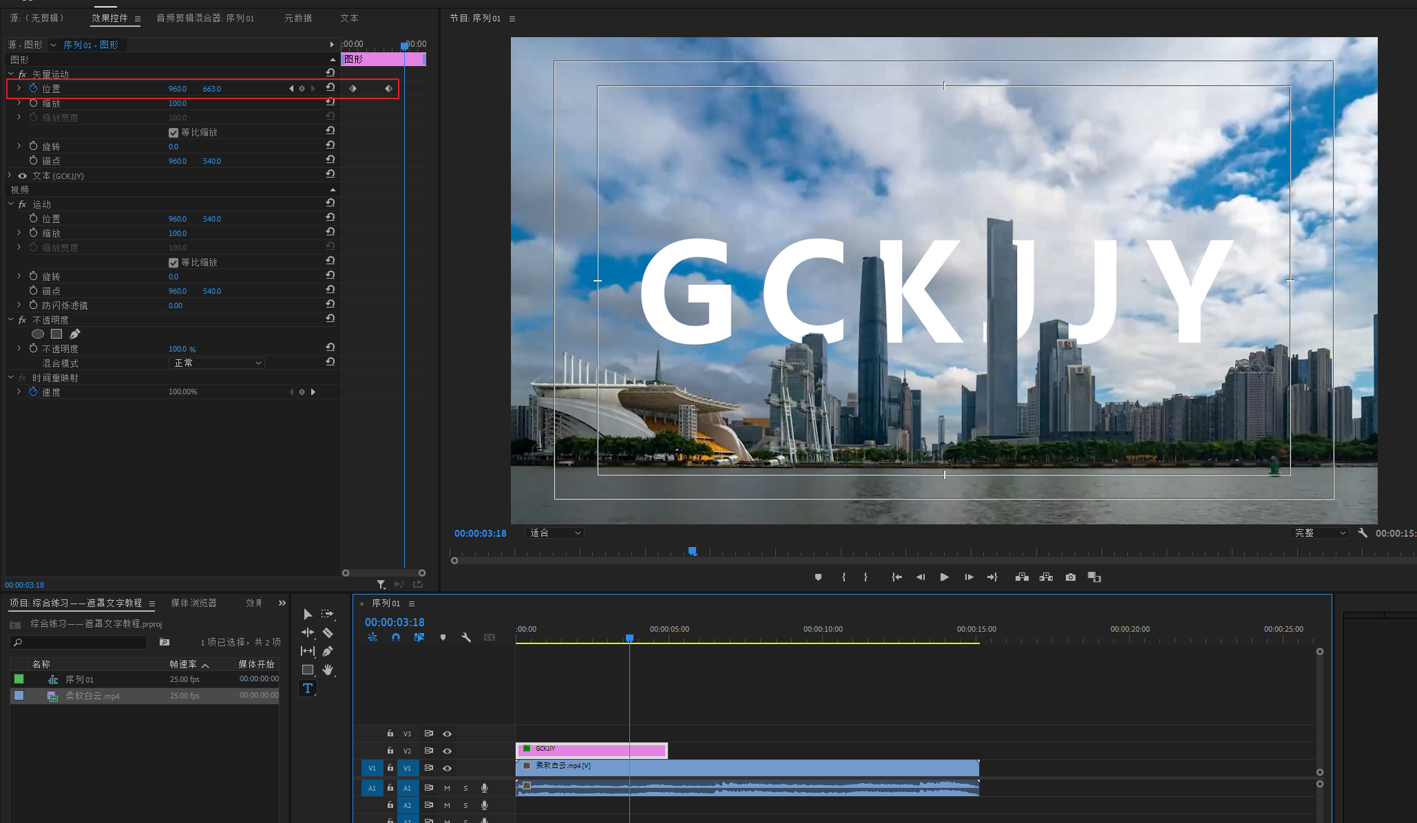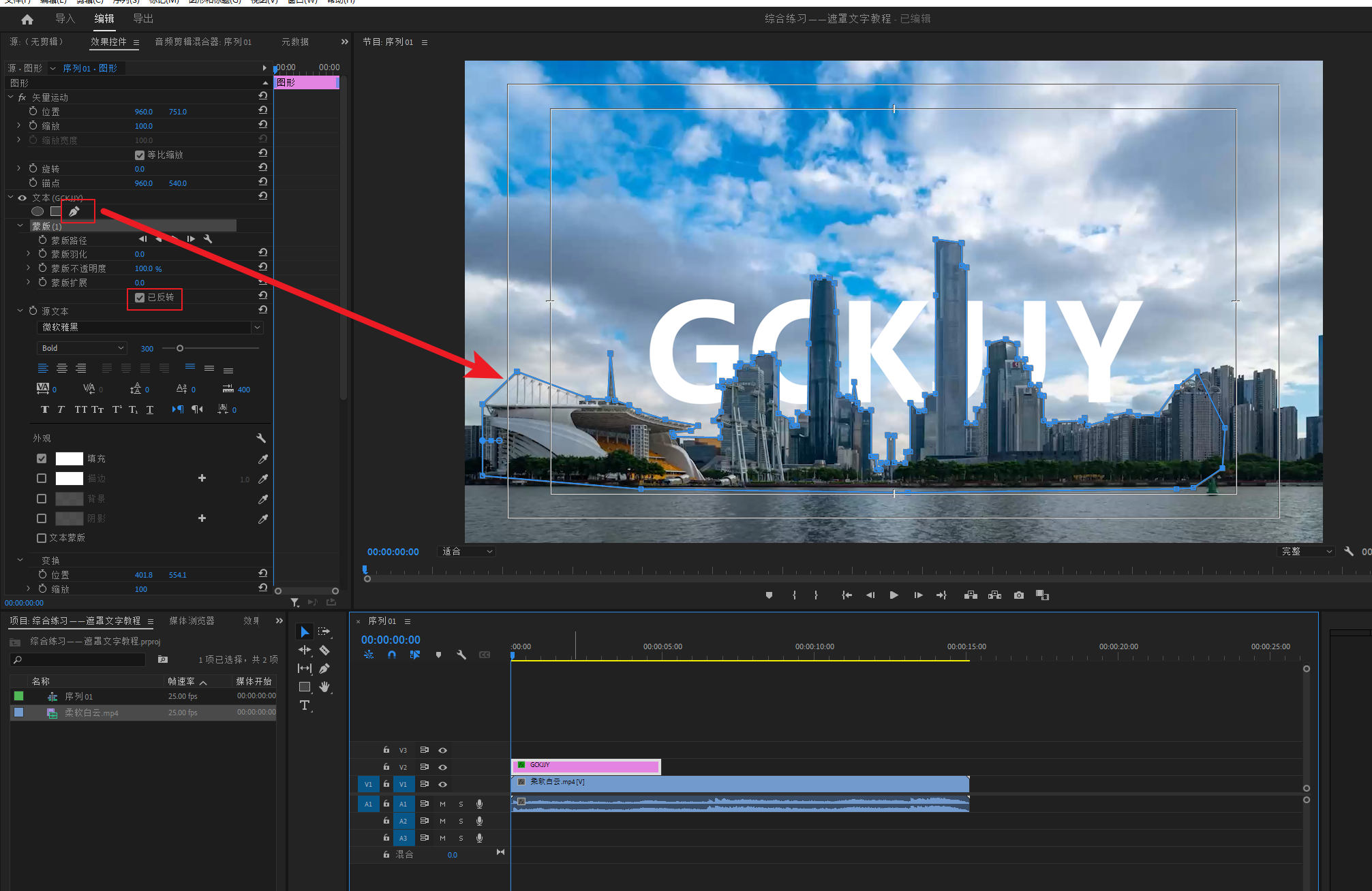 在文字层的属性内画一个遮罩,遮罩大小就是文字想要在什么建筑物后边就画在哪里。勾选遮罩反转。
