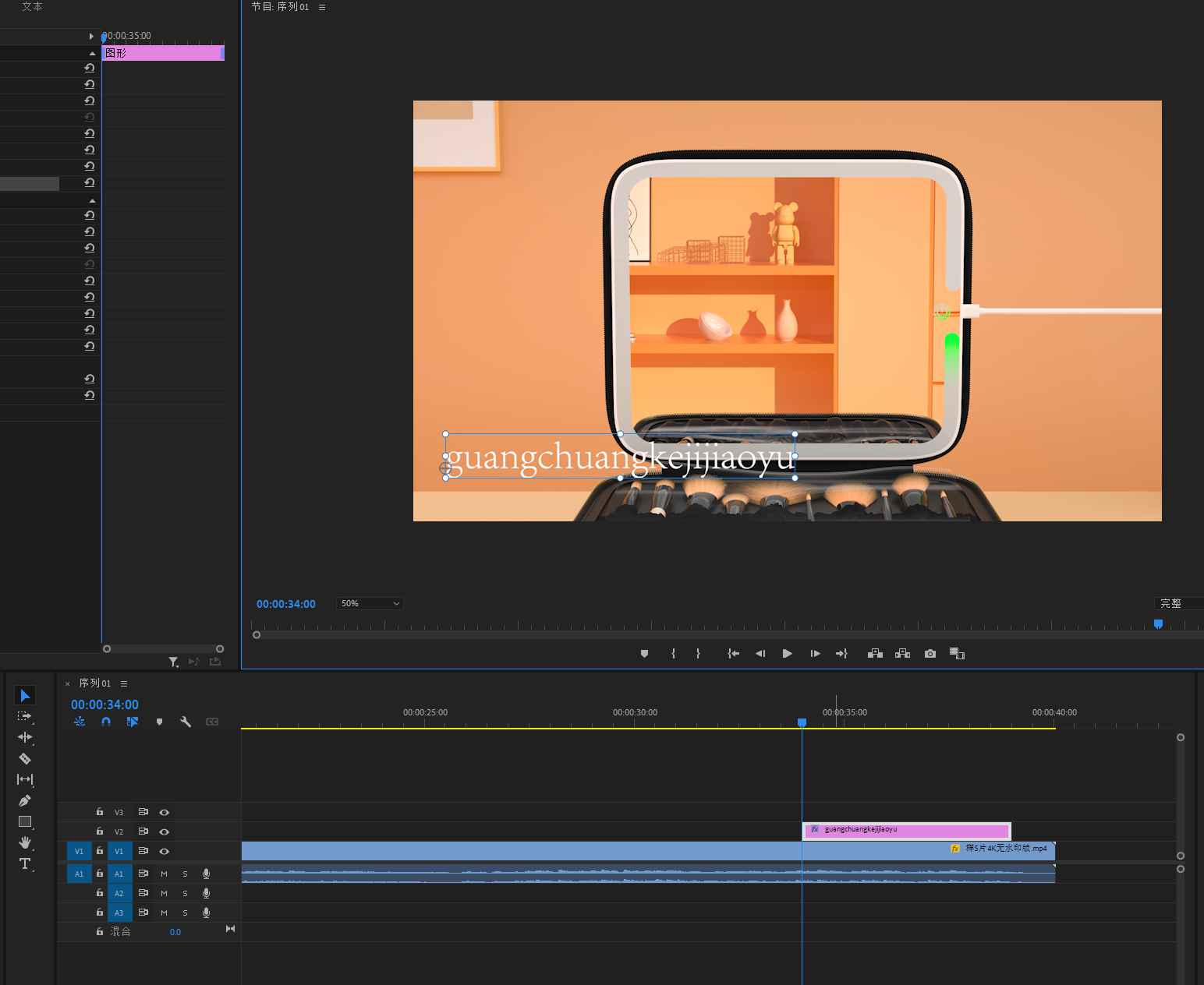 使用方法:切换到文字工具后直接在预览视窗上单击,这时就会出现一个横向文字框,在时间线上也会生成一个文字素材
